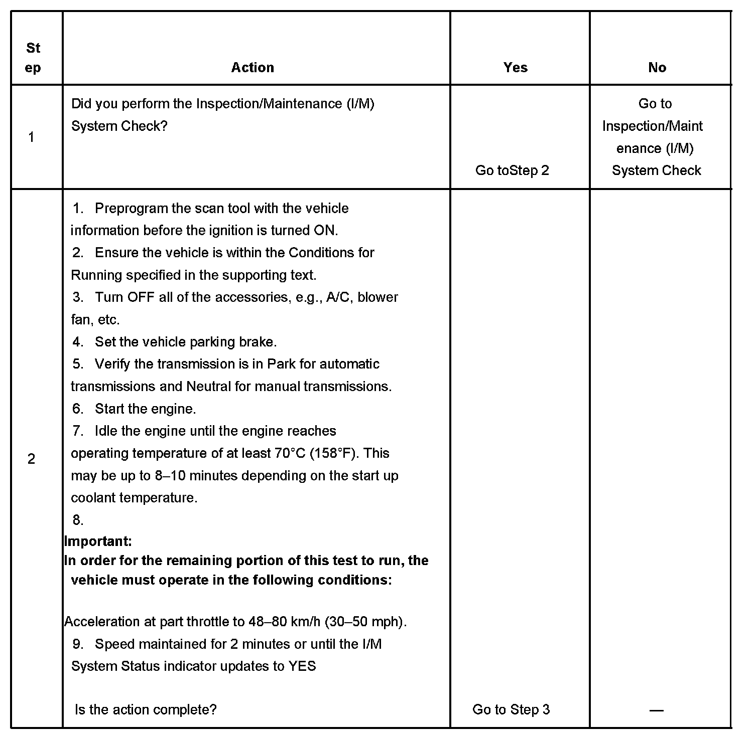 DESCRIPTIONThe purpose of the I/M Complete System Set Procedure is to satisfy the enable criteria necessary to execute all of the I/M readiness diagnostics, and complete the trips for those particular diagnostics. When all diagnostic tests are completed, the I/M System Status indicators are set to YES. Perform this test when more than one or all of the I/M System Status indicators are set to NO.