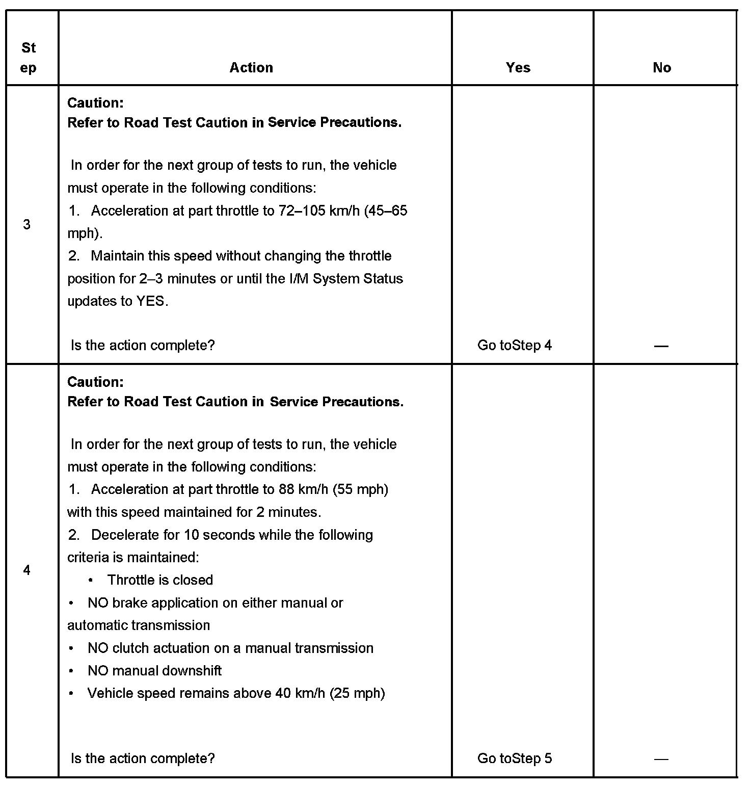 The scan tool can be used to monitor each of the I/M System Status indicators during the I/M Complete System Set Procedure. When all of the indicators for a test step have updated to YES, testing can move on to the next step even if the remaining portion of the test is not complete. For example, step 3 is designed to run the Catalyst Test. The procedure instructs the technician to operate the vehicle in the enable conditions for 6 minutes. If the test updates to YES within 4 minutes, it is not necessary to continue with the enable conditions and testing can advance to the next step.