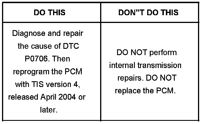 2. Reprogram the PCM with TIS version 4, released in April 2004 or later titled "New calibration to reduce the potential for setting P0706. Also addresses 3-2 downshift feel."