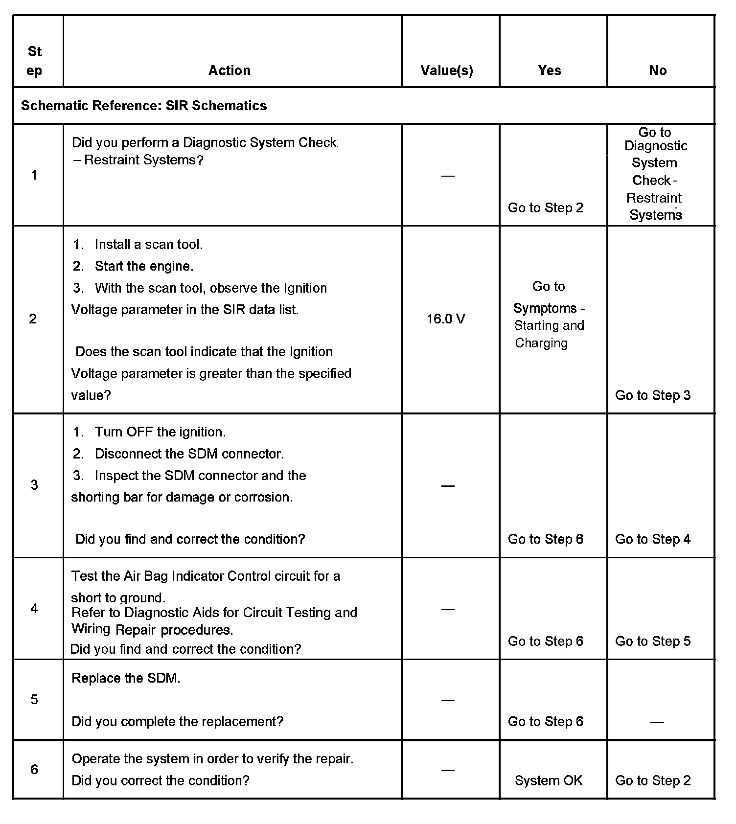CIRCUIT DESCRIPTIONThe ignition switch supplies ignition 1 voltage to the inflatable restraint sensing and diagnostic module (SDM) using the AIR BAG fuse. The ignition switch also supplies battery voltage to the AIR BAG indicator using the IG fuse. The AIR BAG indicator is connected to the AIR BAG indicator output of the SDM. When the ignition switch is first turned to the ON position, the SDM responds by flashing the AIR BAG indicator seven times. If the ignition 1 voltage is outside of the normal operating voltage range (9.0 - 16.0 volts) for more than 25 ms, the AIR BAG indicator will turn ON with no DTCs set.
