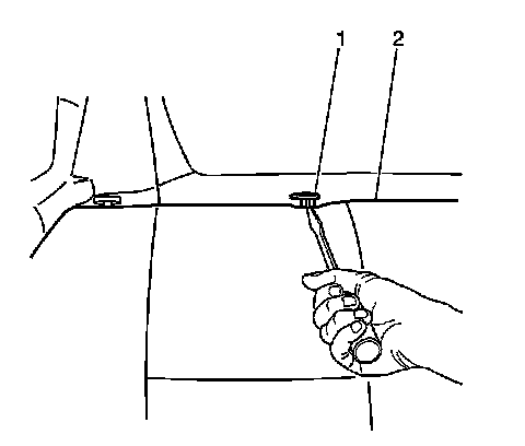 2. Use a flat-bladed tool in order to gently pry the seat head restraint guides (1) from the rear seat back cushion (2), if necessary.