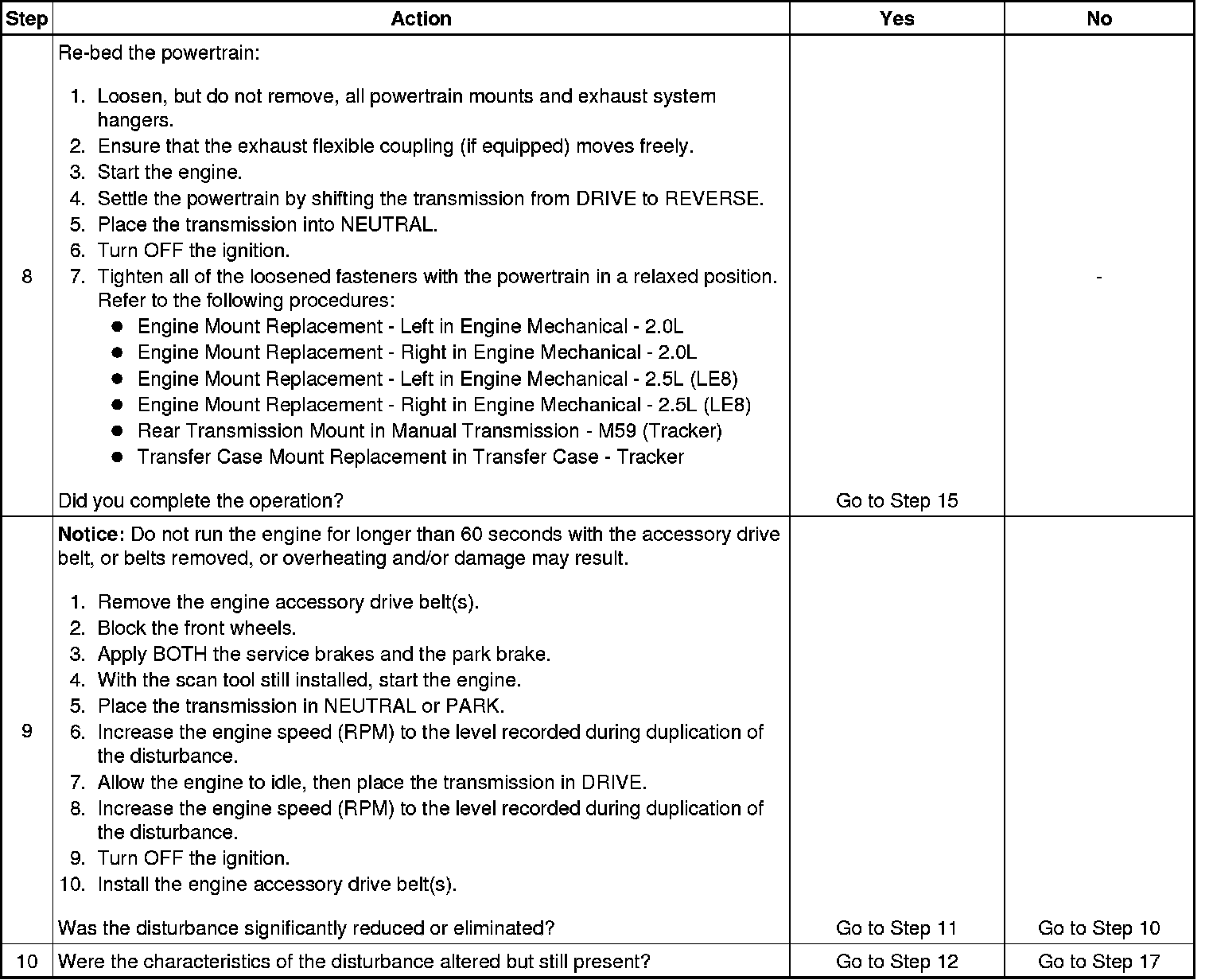 10. Non-rotating engine driven accessory components can no longer produce a unique disturbance. If a disturbance is still present, but the characteristics have been altered, it is possible that these component systems are acting as a transfer path for engine firing frequency or a first order engine disturbance.