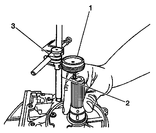14. Measure the output shaft end play using J 8001 (1,3) and J 26900-13 (2).
