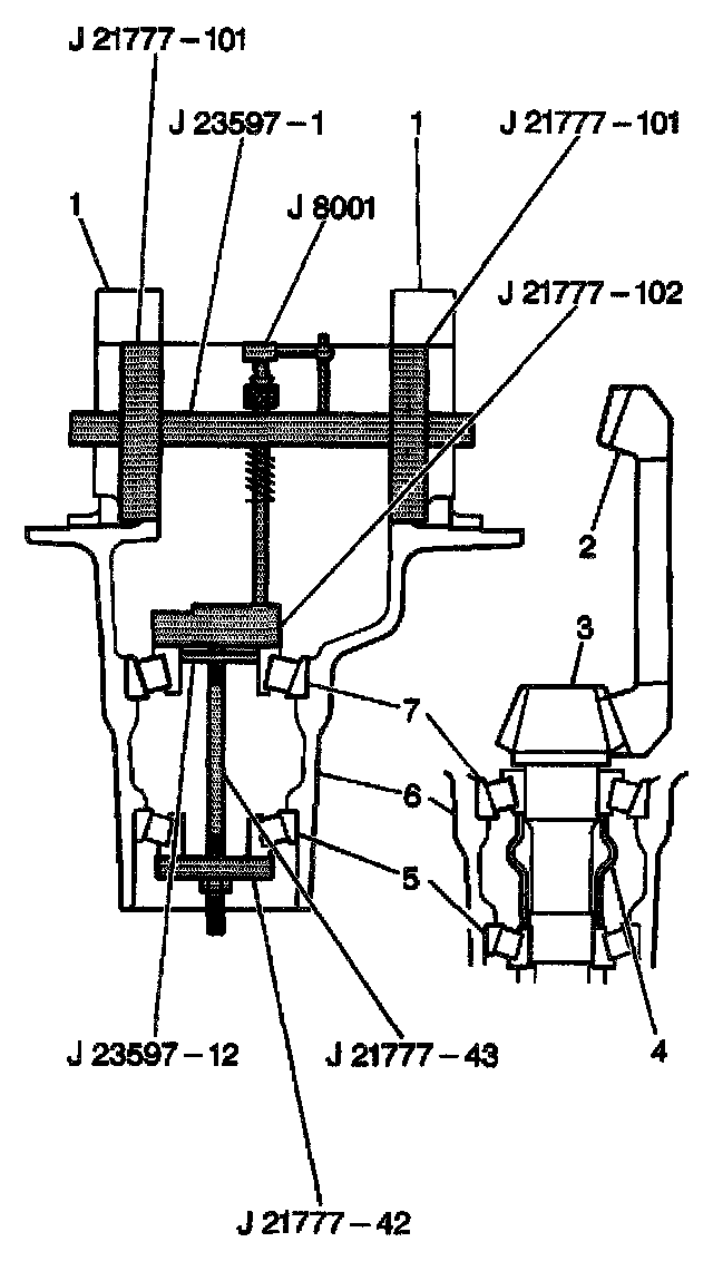 7. Install the J 21777-101 in the side bearing bores with J 23597-1 through both side bearing discs.