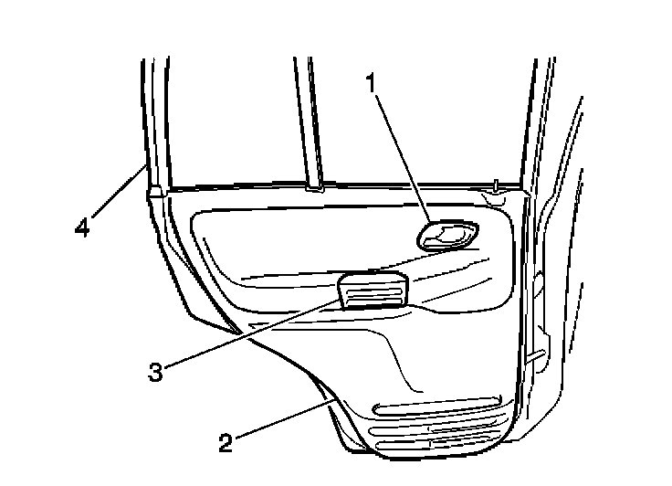3. Gently pry the rear side door trim panel (2) from the rear side door by disengaging the plastic retainers which secure the panel.