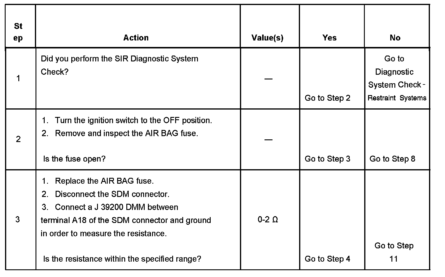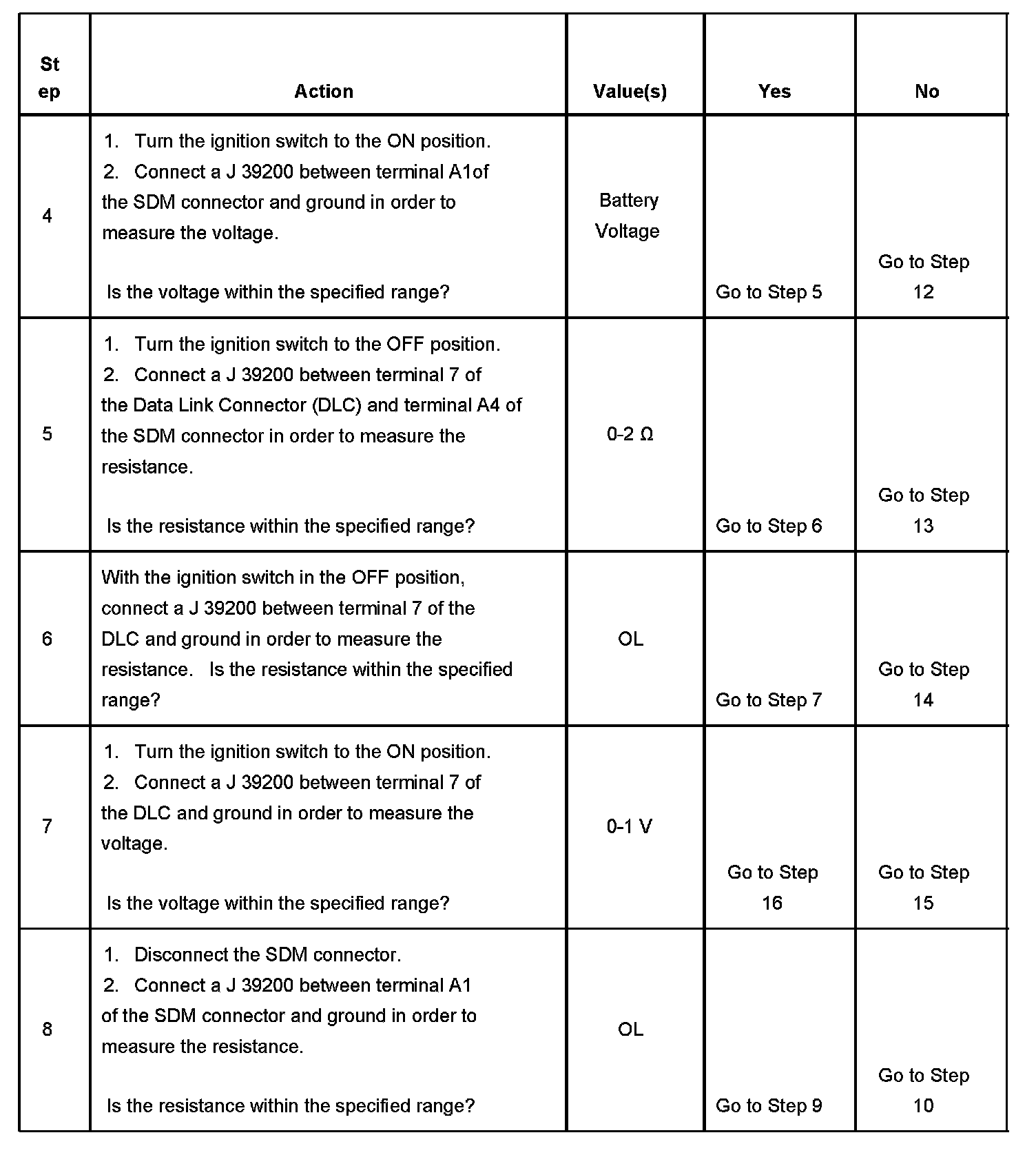 When measurements are requested in this table, use J 39200 Digital Multimeter with the correct terminal adapter from J 35616-A Connector Test Adapter Kit.