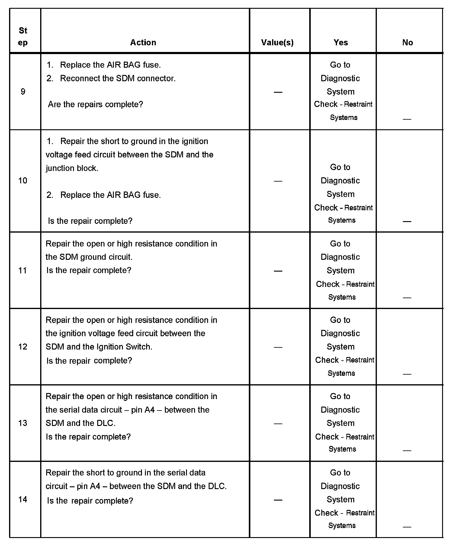 The numbers below refer to the step numbers on the diagnostic table.