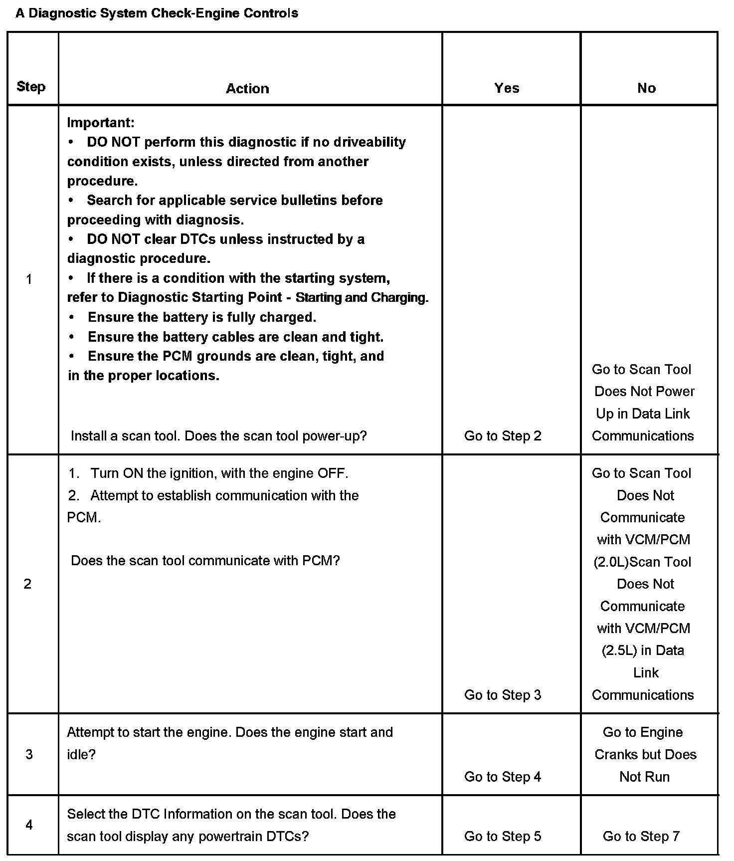 DESCRIPTIONThe Diagnostic System Check-Computers and Control Systems is an organized approach to identifying a condition that is created by a malfunction in the engine control system. The Diagnostic System Check must be the starting point for any driveability concern. The Diagnostic System Check directs the service technician to the next logical step in order to diagnose the concern. Understanding and correctly using the diagnostic table reduces diagnostic time and prevents the replacement of good parts.