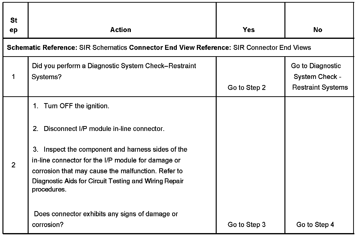 CIRCUIT DESCRIPTIONThe passenger deployment loop consists of a dual stage inflatable restraint I/P module. The I/P module high circuits, and the I/P module low circuits exist for both stages 1 and 2. There are 2 shorting bars used within the I/P module connector. These shorting bars short together the I/P module stage 1 high circuits, and low circuits, and the I/P module stage 2 high circuits and low circuits when the connector is disconnected. This prevents unwanted deployment of the inflator module during servicing. During a frontal crash of sufficient force the inflatable restraint sensing and diagnostic module (SDM) will allow current to flow through the deployment loop. This flow of current will deploy the I/P module. The SDM performs continuous diagnostic tests on the deployment loops to check for proper circuit continuity, and for shorts-to-ground or voltage. If a malfunction is detected, a DTC will be stored in memory.