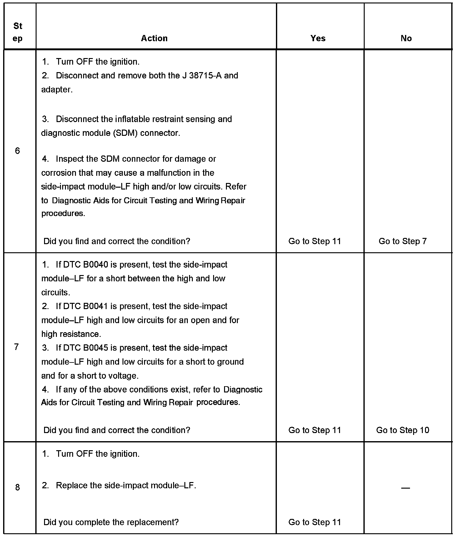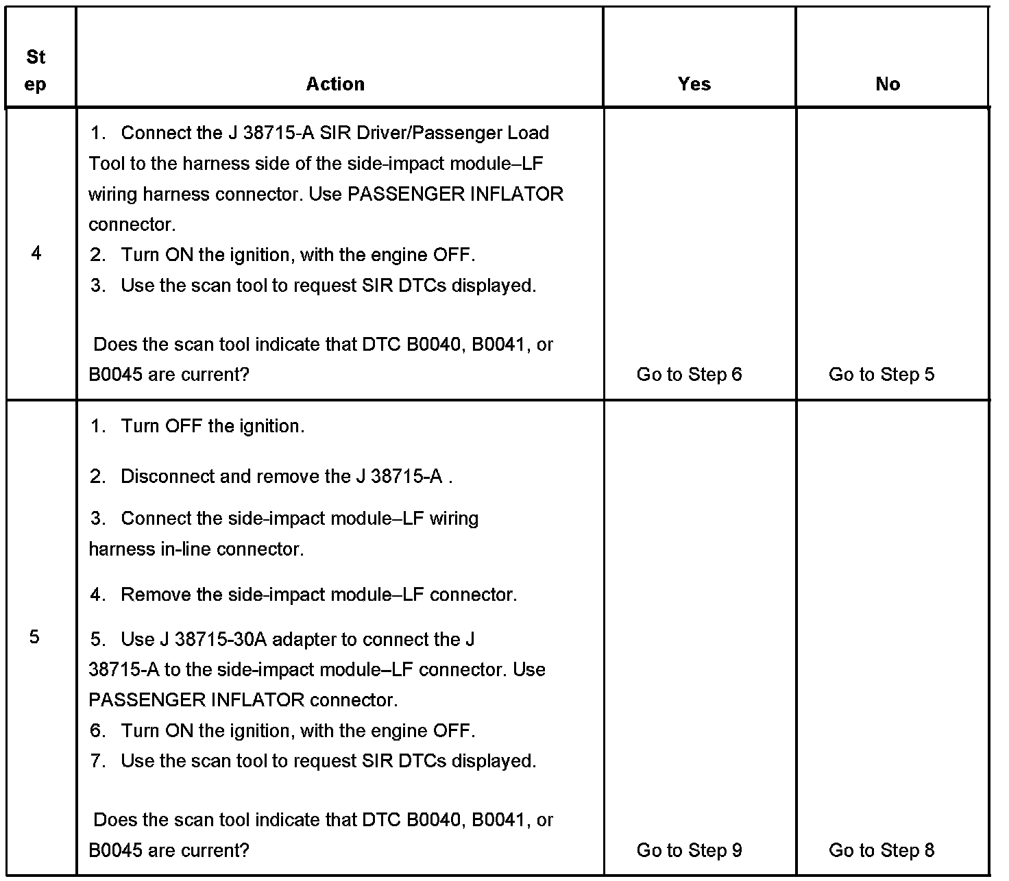 7. Determines which DTCs are present. If DTC B0040 s present, test the side-impact module-LF for a short between high circuits and low circuits. If DTC B0041 is present, test the side-impact module-LF high circuits and low circuits for an open and for high resistance. If DTC B0045 is present, test the side-impact module-LF high circuits and low circuits for a short-to-ground, or a short-to-voltage.