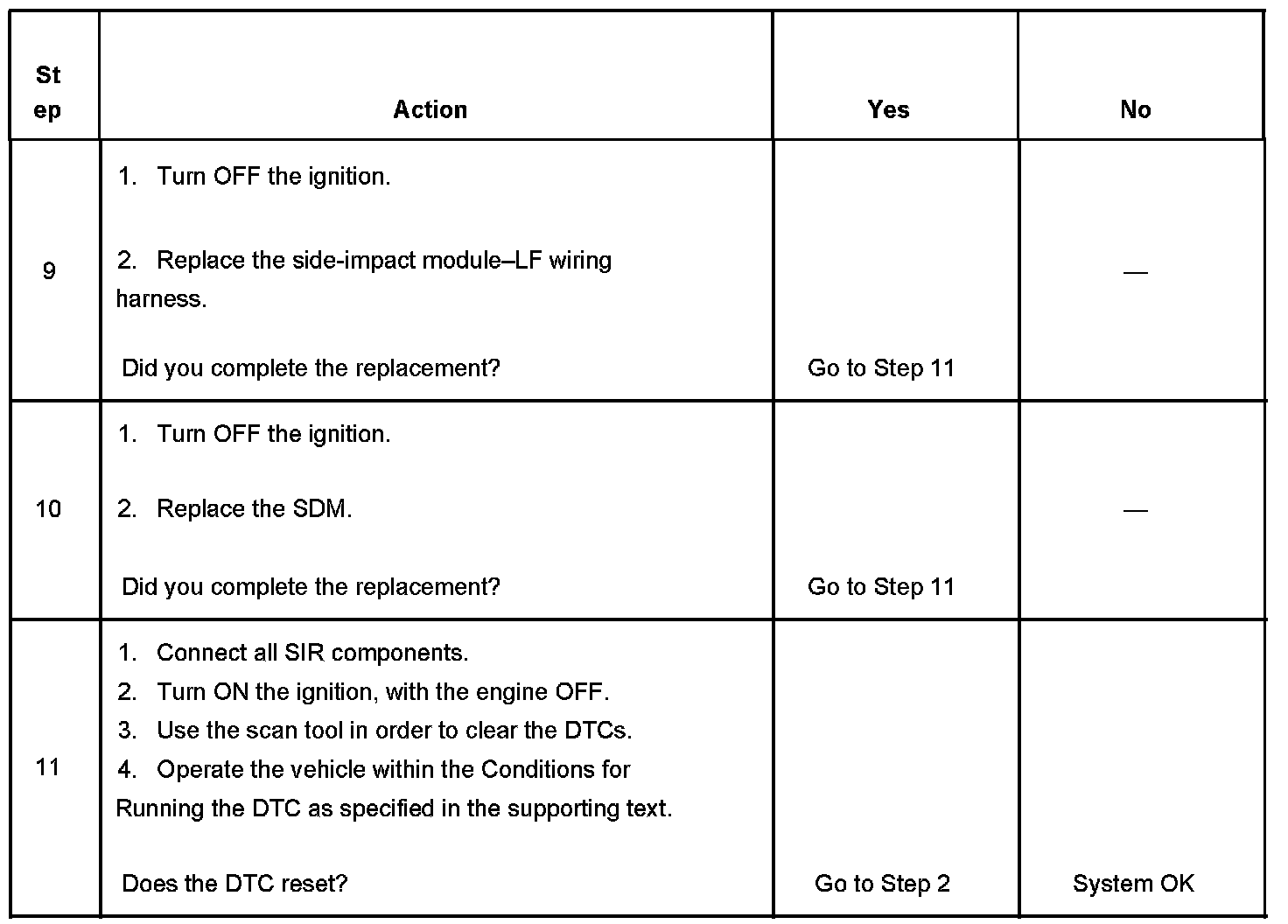 - A side-impact module-LF high circuit is less than 2.4 volts and the side-impact module-LF deployment loop is more than 6 ohms for 500 milliseconds.