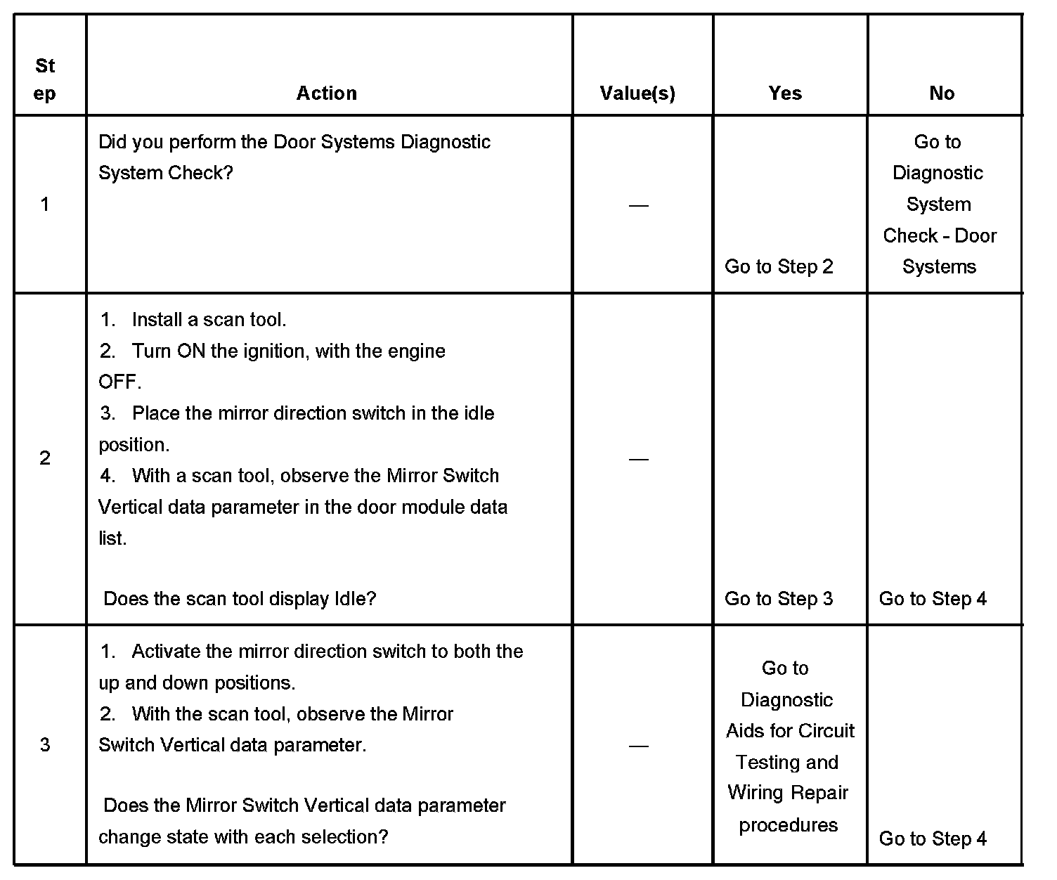 The driver door module supplies battery positive voltage to the power mirror switch. When the mirror direction switch is placed in the up or down position, the appropriate signal circuit is switched to battery voltage. The driver door module senses the voltage change and activates the selected outside rearview mirror in the appropriate direction.