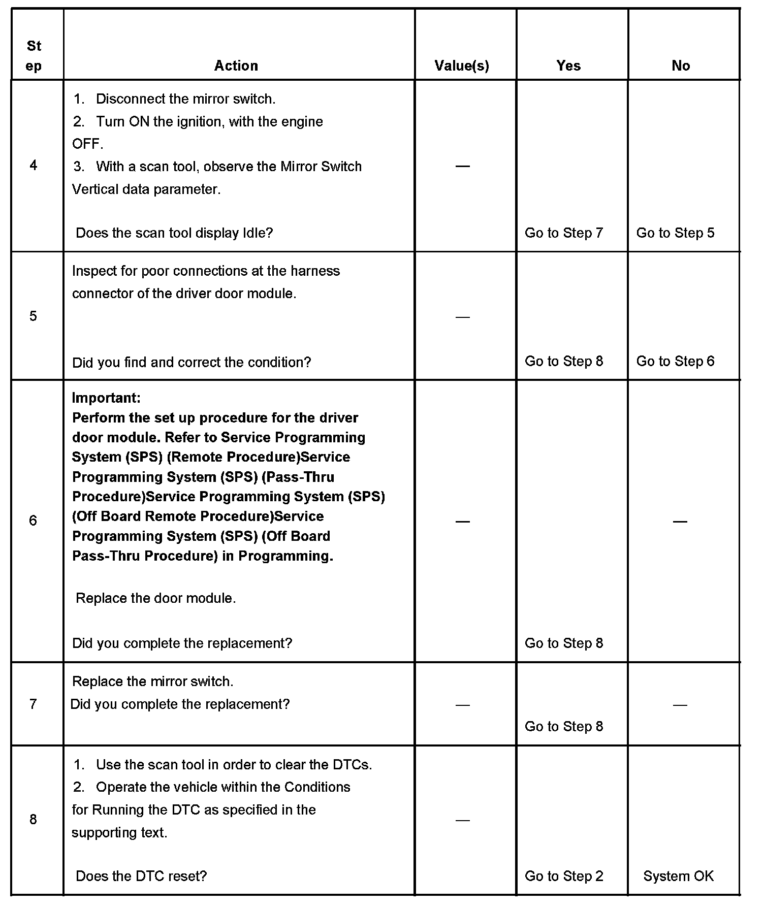 When the fault is no longer present, the door module changes the current DTC to a history DTC. The door module will clear the history DTC after 50 fault free ignition cycles, or in response to a scan tool command.