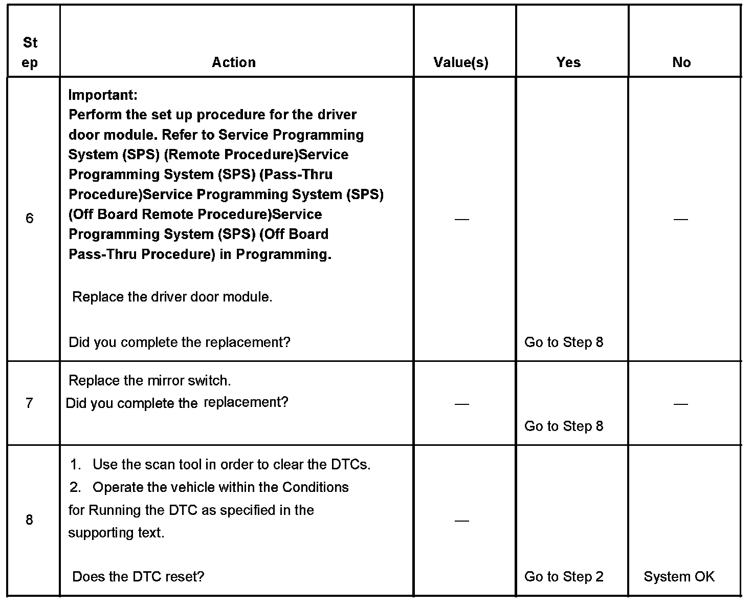 When the fault is no longer present, the door module changes the current DTC to a history DTC. The door module will clear the history DTC after 50 fault free ignition cycles, or in response to a scan tool command.