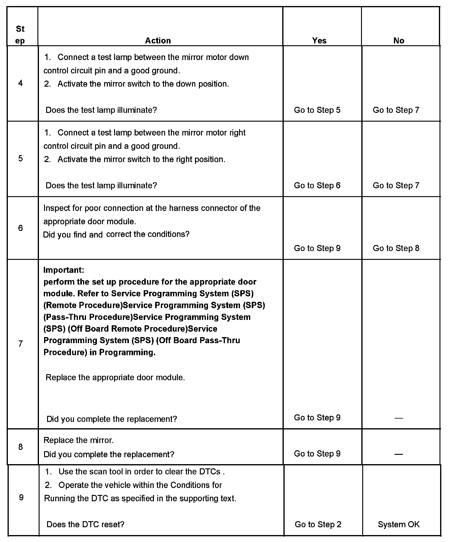 - If the mirror motor down control circuit is shorted to battery voltage and the mirror is commanded up.
