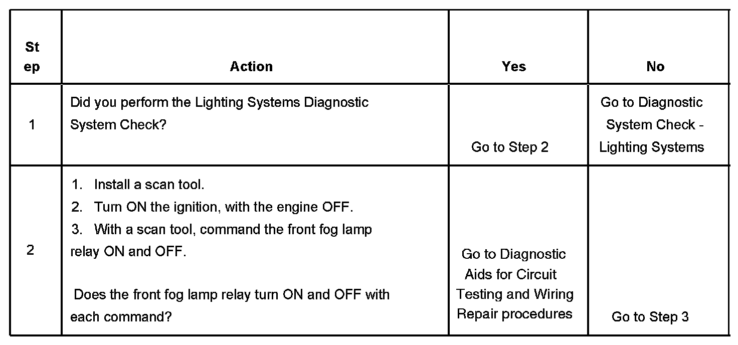 When the BCM senses that the front fog lamp switch signal circuit is grounded momentarily by pressing the front fog lamp switch, the BCM energizes the front fog lamp relay by grounding the front fog lamp relay control circuit. The front fog lamp indicator is also illuminated utilizing the same fog lamp relay control circuit.