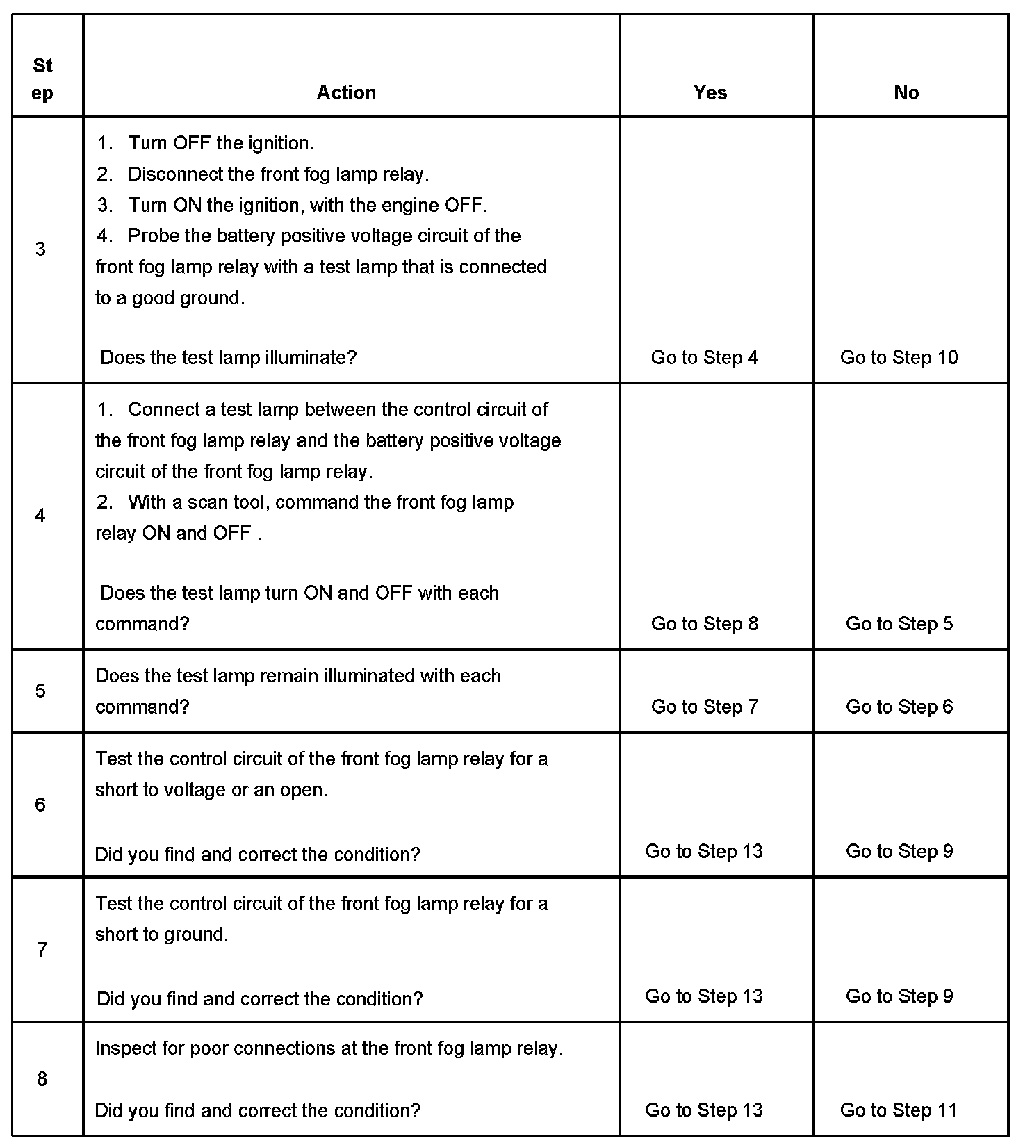 6. Tests if there is opposing voltage present or an open in the front fog lamp relay control circuit.