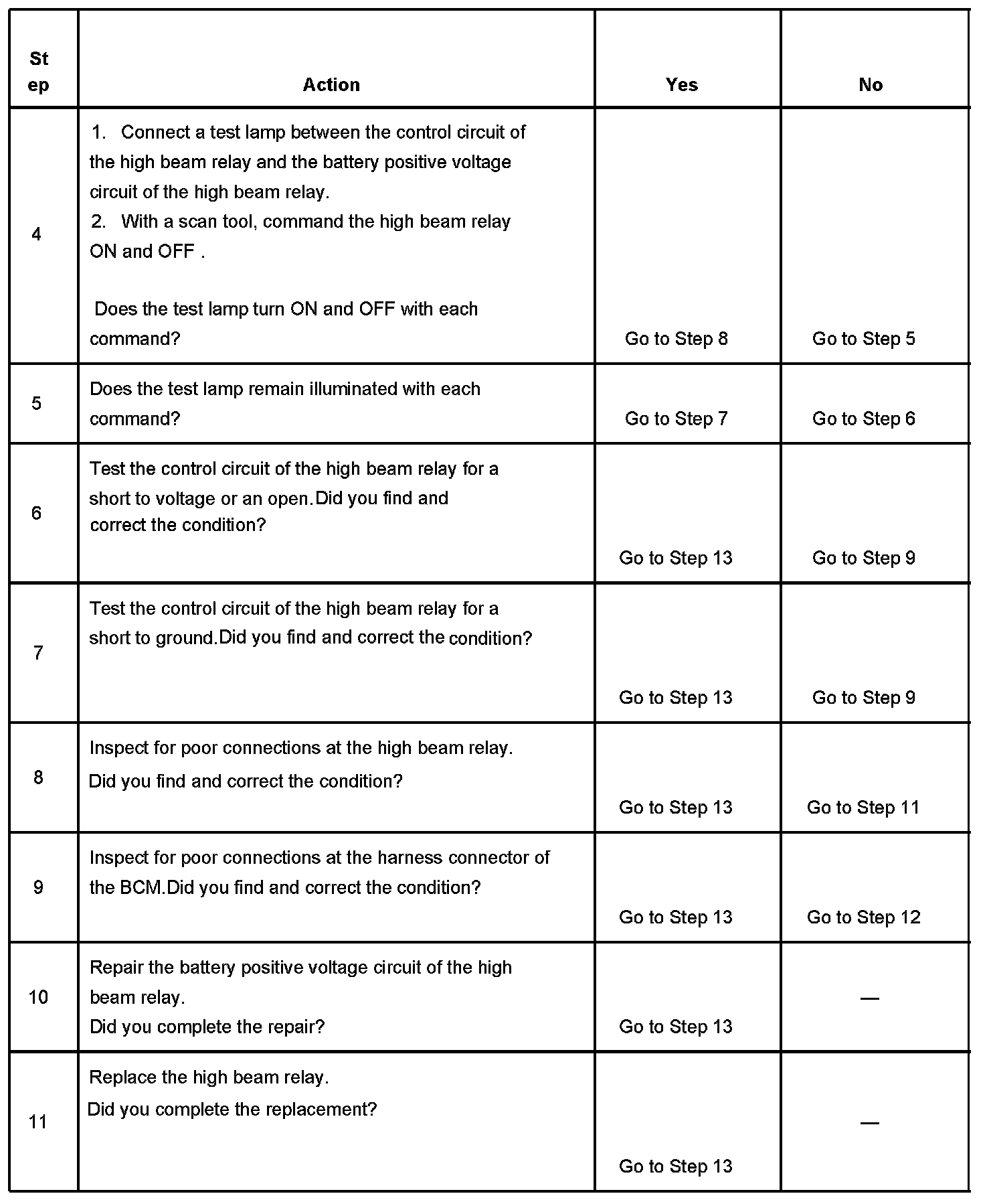 - When the BCM receives a high beam headlamp ON command and the high beam headlamp relay control circuit is shorted to voltage or open.