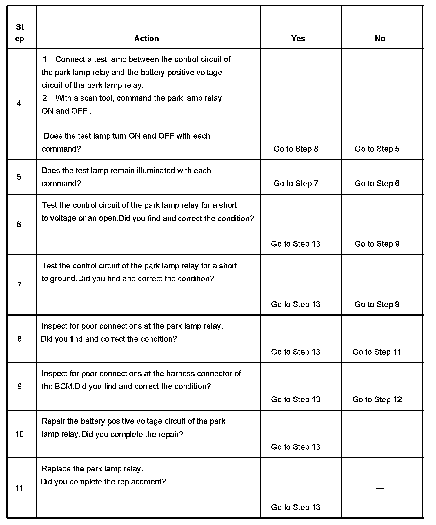 - When the BCM receives a park lamp OFF command and the park lamp lamp relay control circuit is shorted to ground.