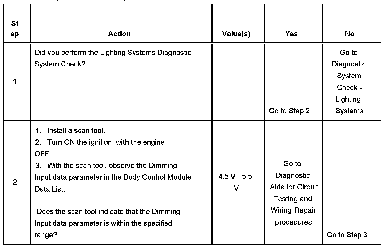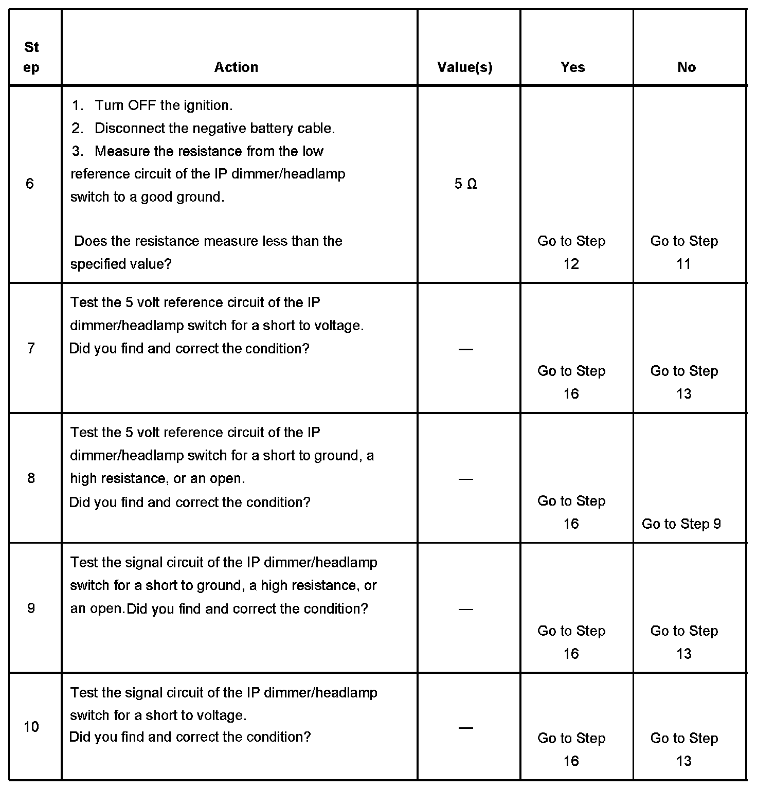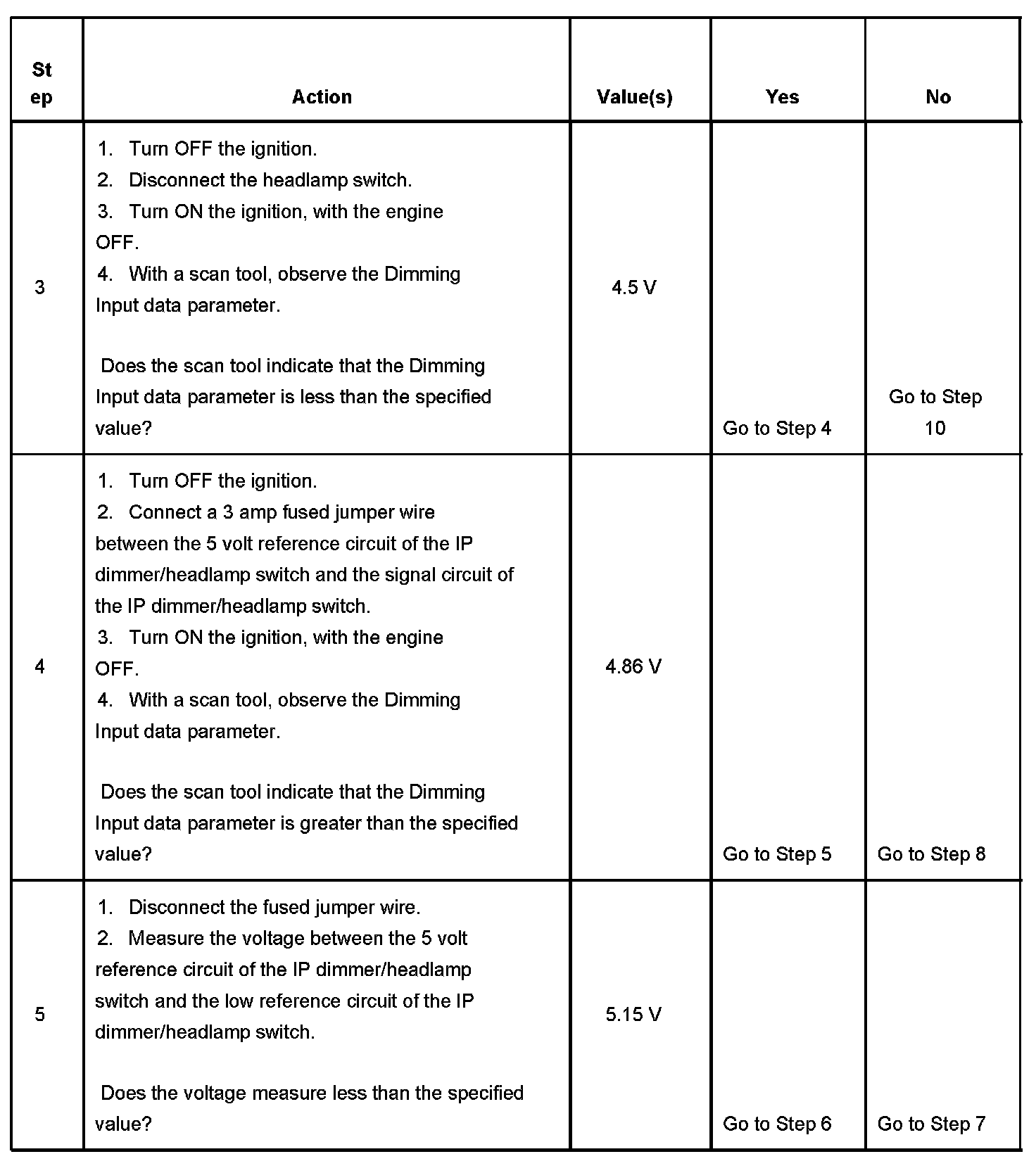 The BCM directly sends a 5 volt reference voltage to the IP dimmer switch which is then adjusted based on the IP dimmer switch position and returned as a low reference and a signal to the BCM. The BCM uses this signal to directly control the desired level of instrument panel illumination lamp intensity.
