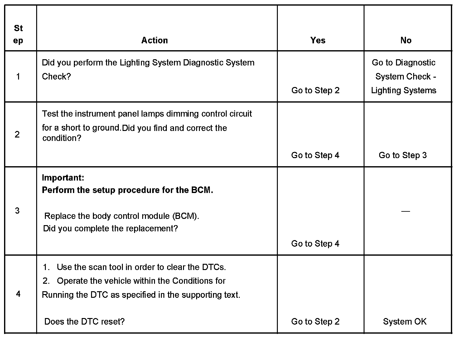 - When the BCM receives a instrument panel lamps illumination request signal and the instrument panel lamps dimming control circuit is shorted to ground.