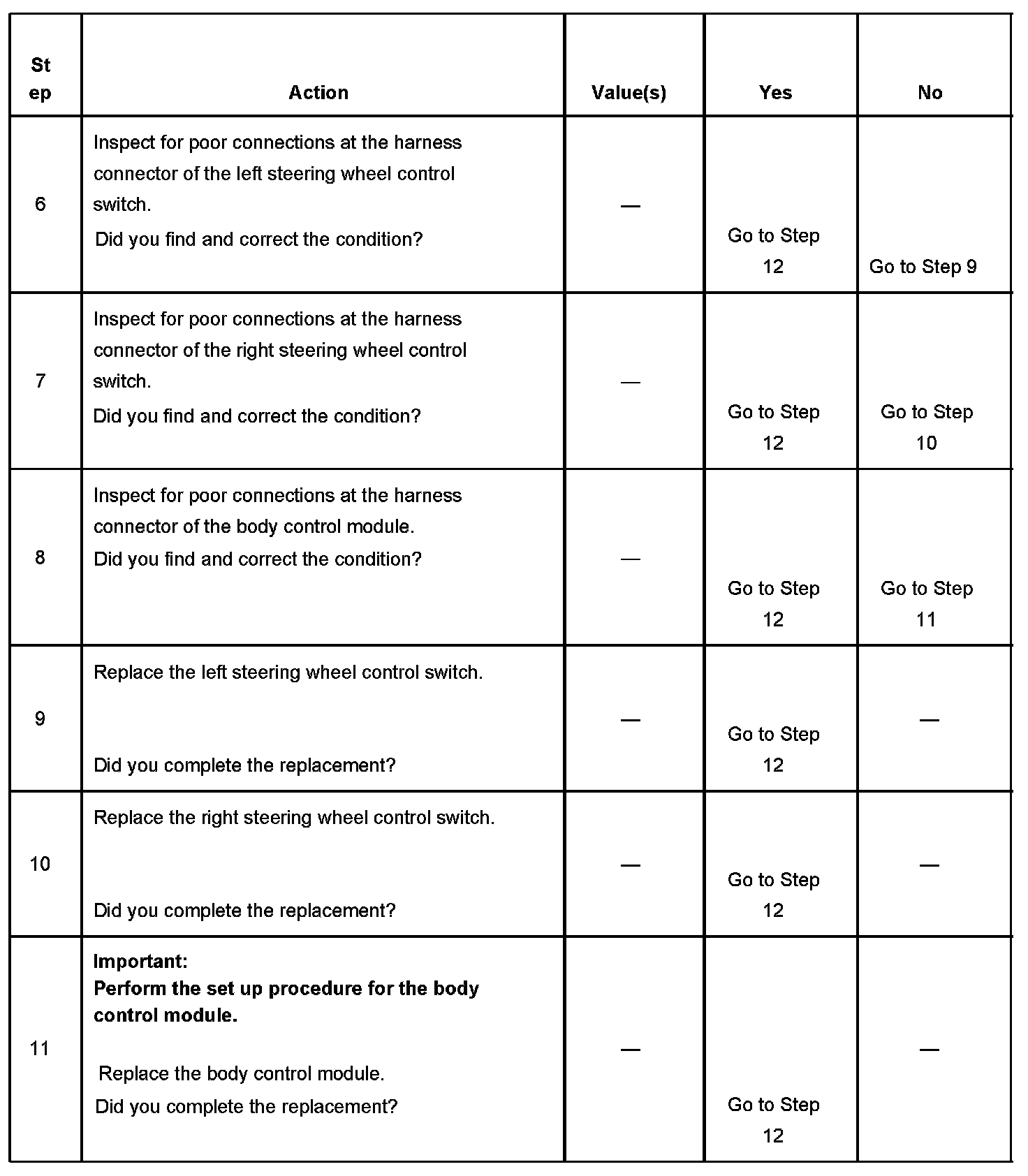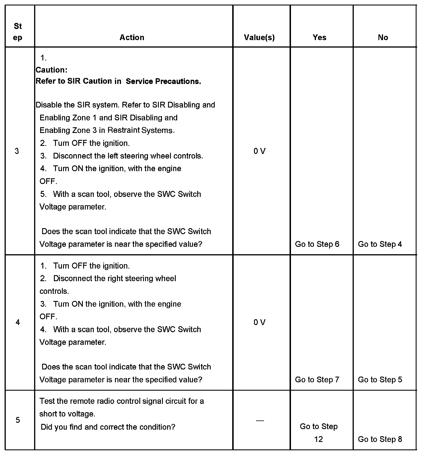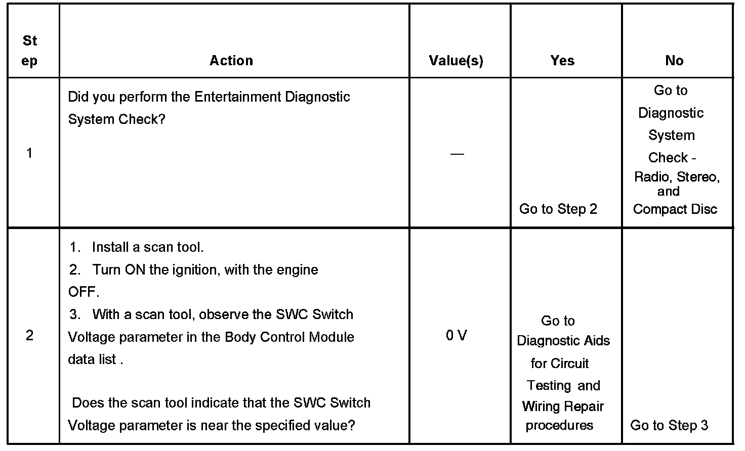 The steering wheel controls are momentary contact switches that connect a series of resistors so that each switch selection corresponds to a fixed resistance value. The body control module (BCM) determines which switch has been pressed by the voltage drop across the corresponding resistance value. The BCM supplies voltage to the steering wheel controls through the rear wiper/washer switch supply voltage circuit. The BCM monitors the switch voltage on the remote radio control signal circuit.