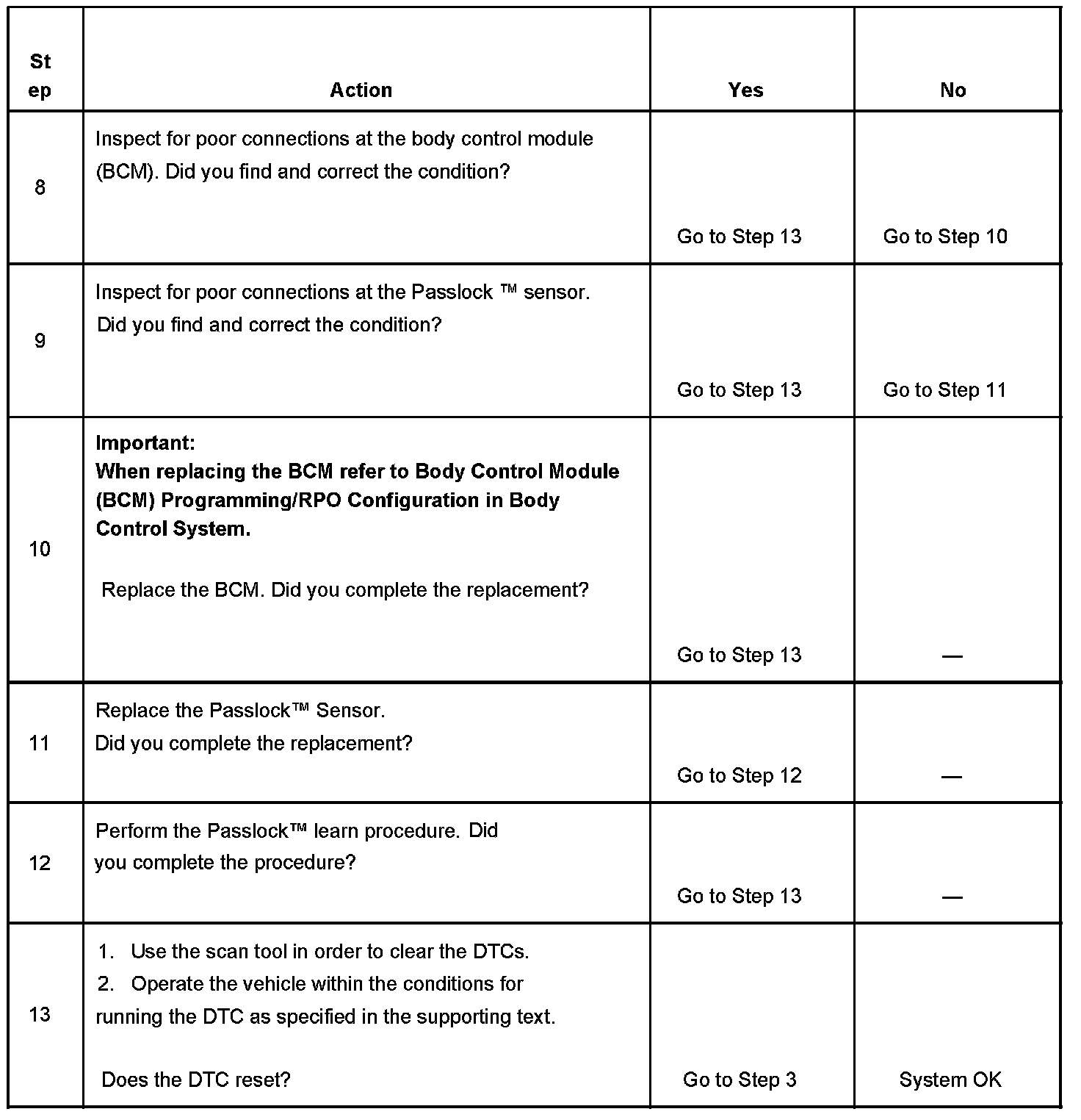 - When a short to ground, battery or open is no longer present on the Passlock sensor power circuit, the ignition switch must be cycled from OFF to ON before this DTC can change from a current DTC to a history DTC.