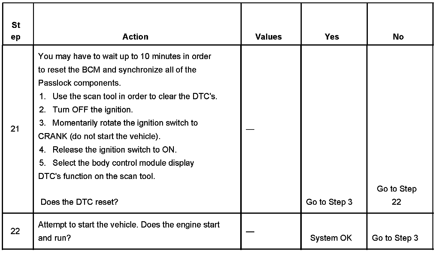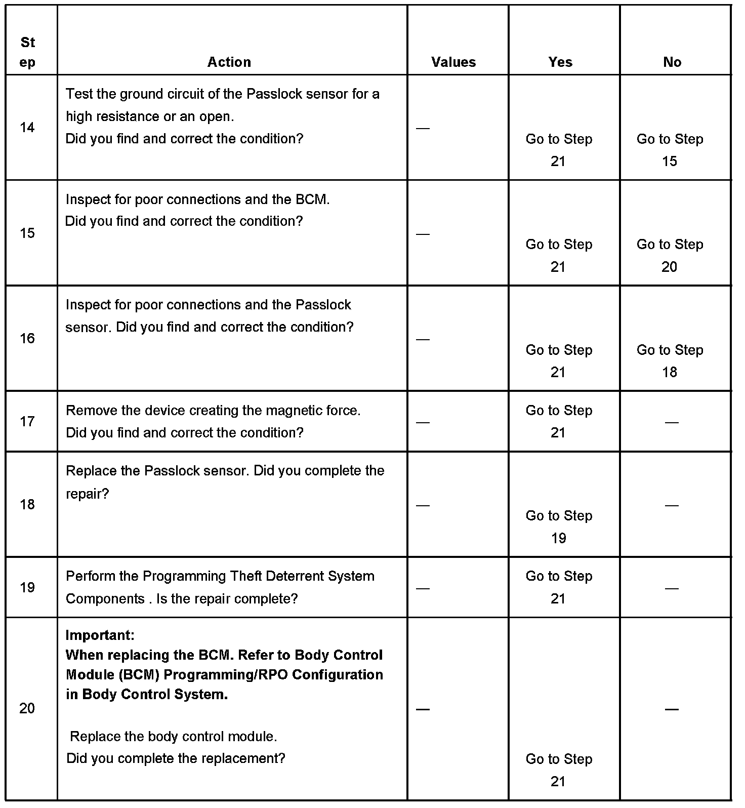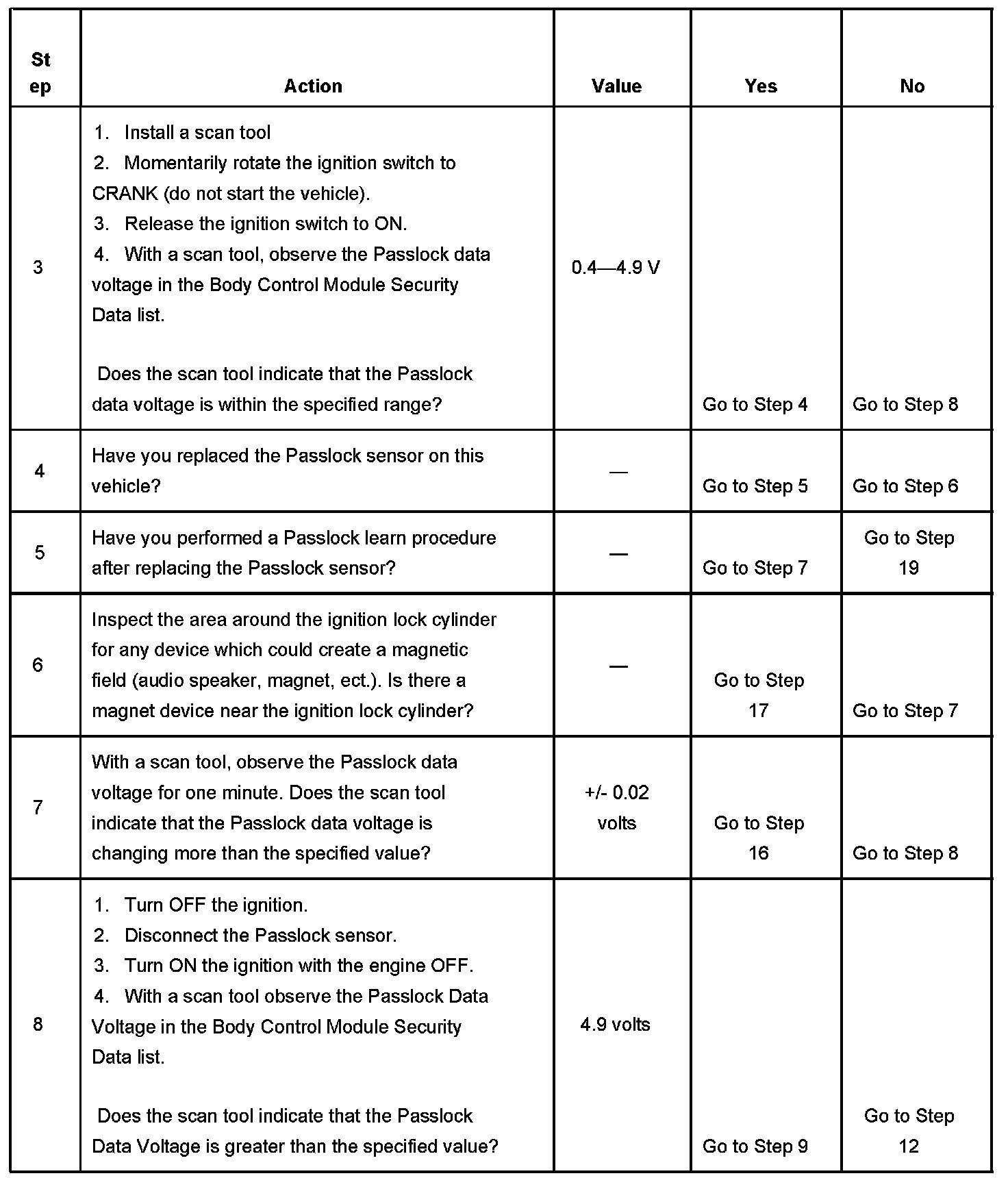 The Passlock system is provided in order to prevent vehicle theft if the ignition lock is forced to rotate or the ignition switch is operated while separated from the ignition lock cylinder case. The body control module (BCM) provides security system sensor power and low reference for the Passlock sensor. The BCM also measures the security system sensor voltage. When the correct key is used to start the vehicle, a magnet on the lock cylinder passes close to the Passlock sensor within the ignition lock cylinder case. The magnet activates the security hall effect sensor in the Passlock sensor which completes a circuit from the security sensor signal circuit through a resistor to the security sensor low reference circuit. The resistance value will vary from vehicle to vehicle. The BCM will measure the voltage on the security sensor signal circuit and compare this voltage to a previously learned voltage. If the voltage measured is within the valid range, the BCM will send a class 2 message to the powertrain control module (PCM) to enable vehicle starting. If the voltage measured is not within the valid range, a class 2 message will be sent to the PCM to disable starting of the vehicle.