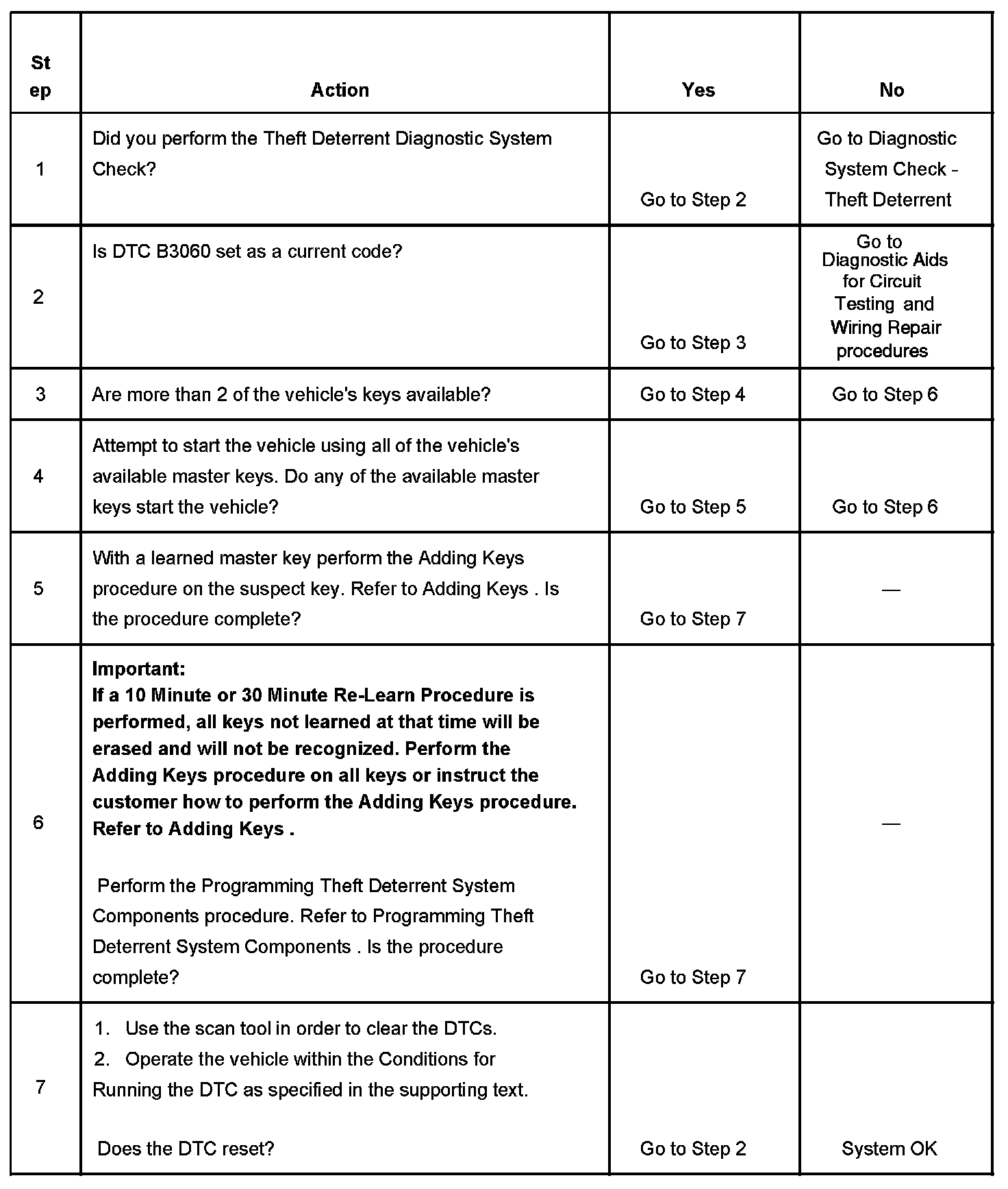 6. To set this DTC, a key with a working transponder that is not learned was read by the theft deterrent control module. For that key to operate the vehicle, a 10 Minute Re-Learn Procedure or 30 Minute Re-Learn Procedure must be performed.