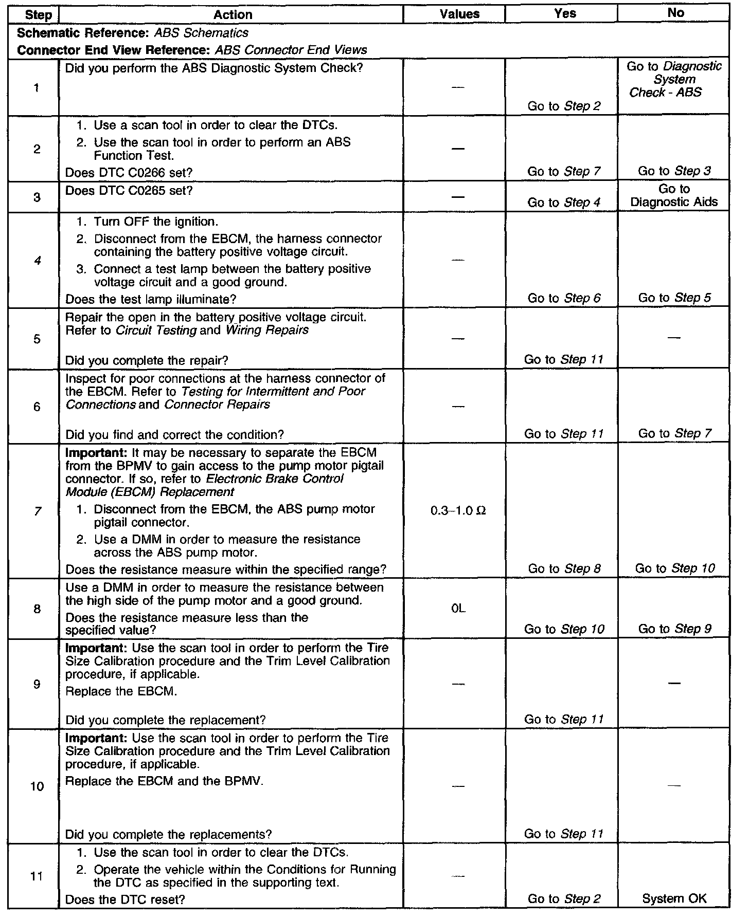 Important: Whenever the EBCM is replaced for DTC C0265 or C0266, the ABS pump motor and motor circuitry must be tested for the proper resistance. Refer to steps 7 and 8 in the diagnostic table below for testing procedures and resistance values.
