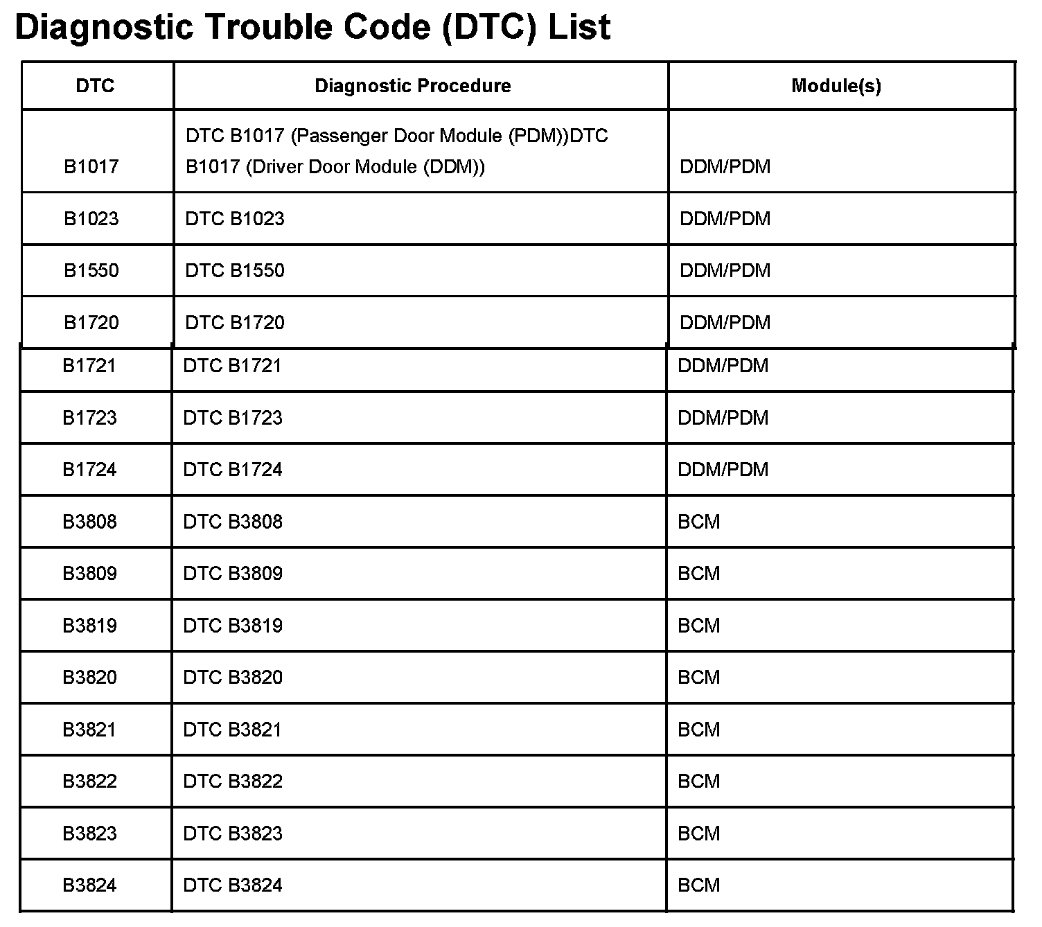 DTCs B1017 - B3824: