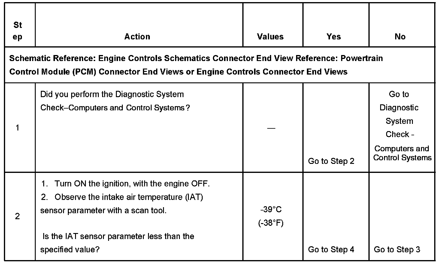 The PCM detects that the IAT sensor parameter is less than -39°C (-38°F) for more than 6 seconds.
