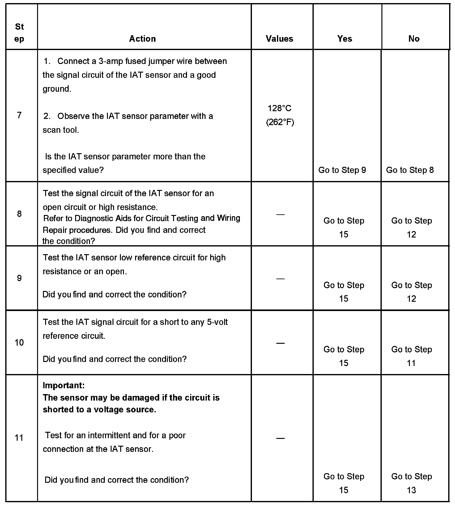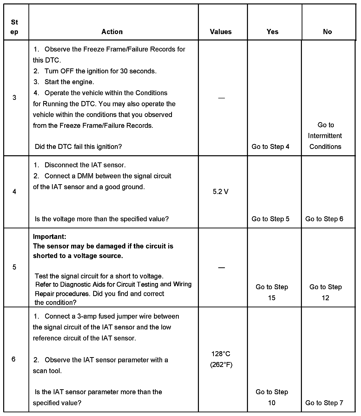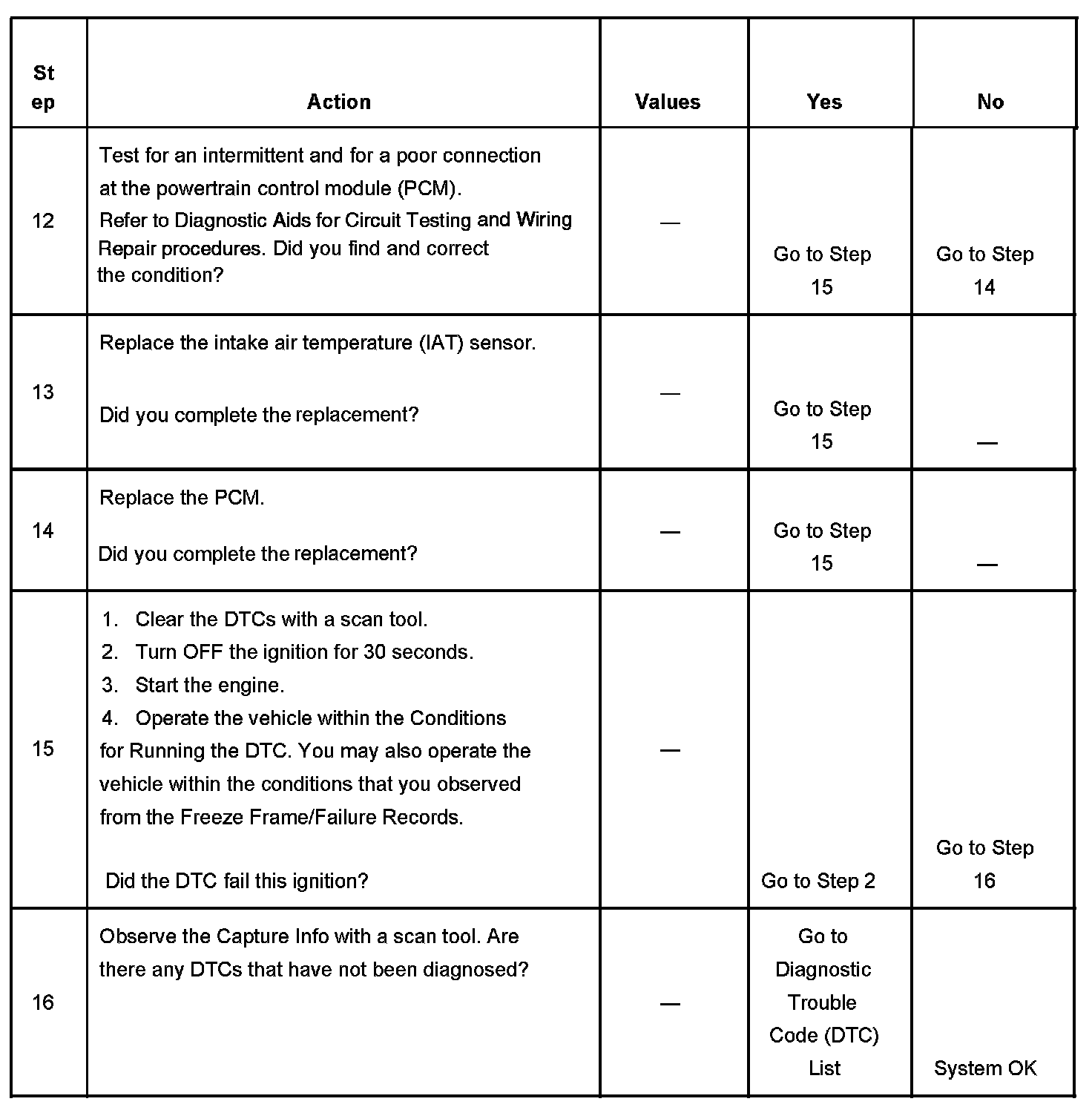 CIRCUIT DESCRIPTIONThe intake air temperature (IAT) sensor is a variable resistor. The IAT sensor has a signal circuit and a low reference circuit. The IAT sensor measures the temperature of the air entering the engine. The powertrain control module (PCM) supplies 5 volts to the IAT signal circuit and a ground for the IAT low reference circuit. When the IAT sensor is cold, the sensor resistance is high. When the air temperature increases, the sensor resistance decreases. With high sensor resistance, the PCM detects a high voltage on the IAT signal circuit. With lower sensor resistance, the PCM detects a lower voltage on the IAT signal circuit. If the PCM detects an excessively high IAT signal voltage, indicating a low temperature, DTC P0113 sets.