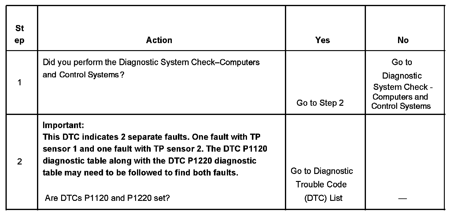 The DTC indicates 2 separate faults, one fault with TP sensor 1 and one fault with TP sensor 2. The DTC P1120 diagnostic table along with the DTC P1220 diagnostic table may need to be followed to find both faults.