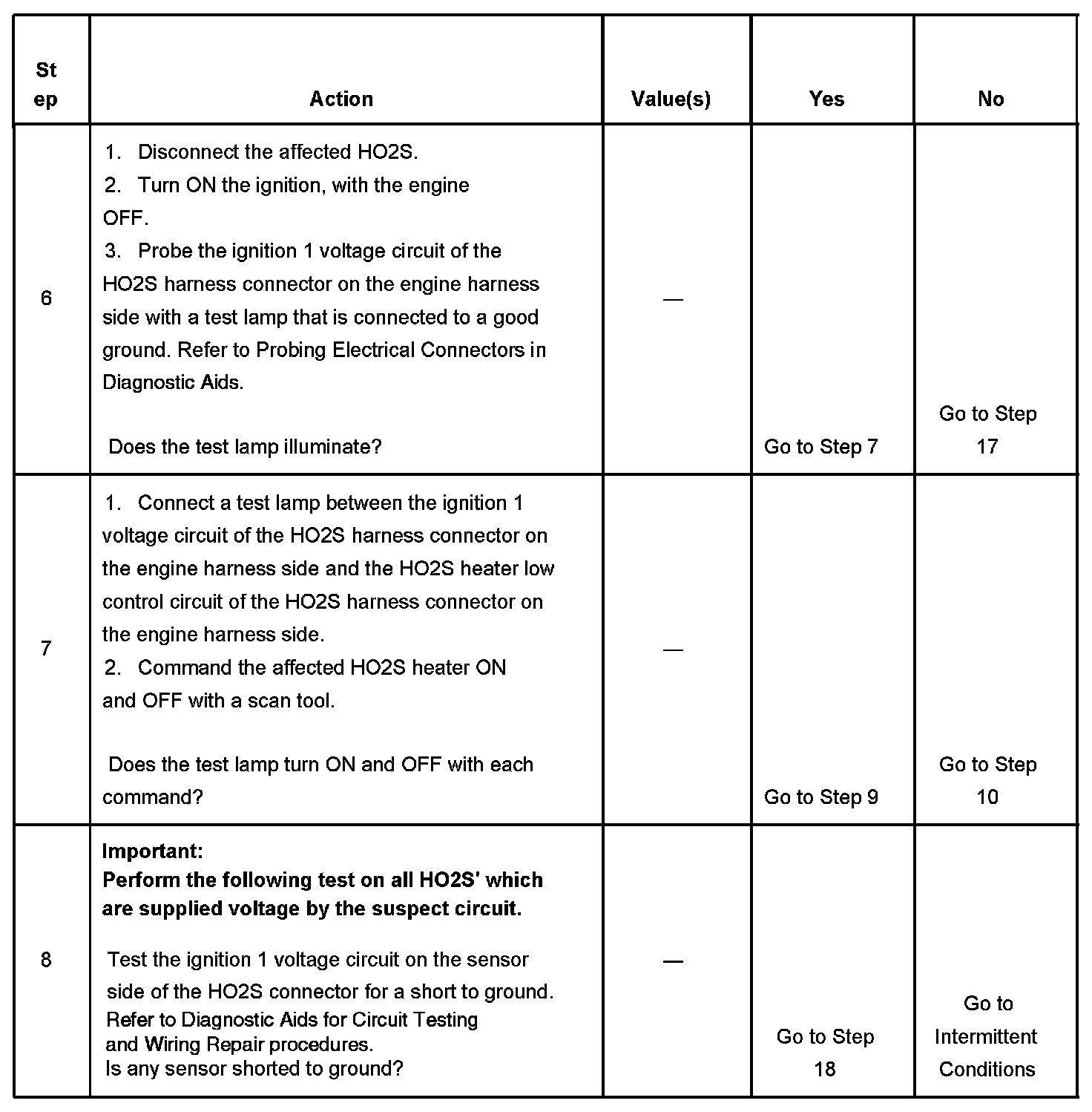 CIRCUIT DESCRIPTIONHeated oxygen sensors (HO2S) are used for fuel control and post catalyst monitoring. Each HO2S compares the oxygen content of the surrounding air with the oxygen content in the exhaust stream. The HO2S must reach operating temperature to provide an accurate voltage signal. A heating element inside the HO2S minimizes the time required for the sensor to reach operating temperature. Voltage is provided to the heater by the ignition 1 voltage circuit through a fuse. With the engine running, ground is provided to the heater by the HO2S heater low control circuit, though a low side driver within the powertrain control module (PCM). The PCM monitors the current flow through the heater for diagnosis.