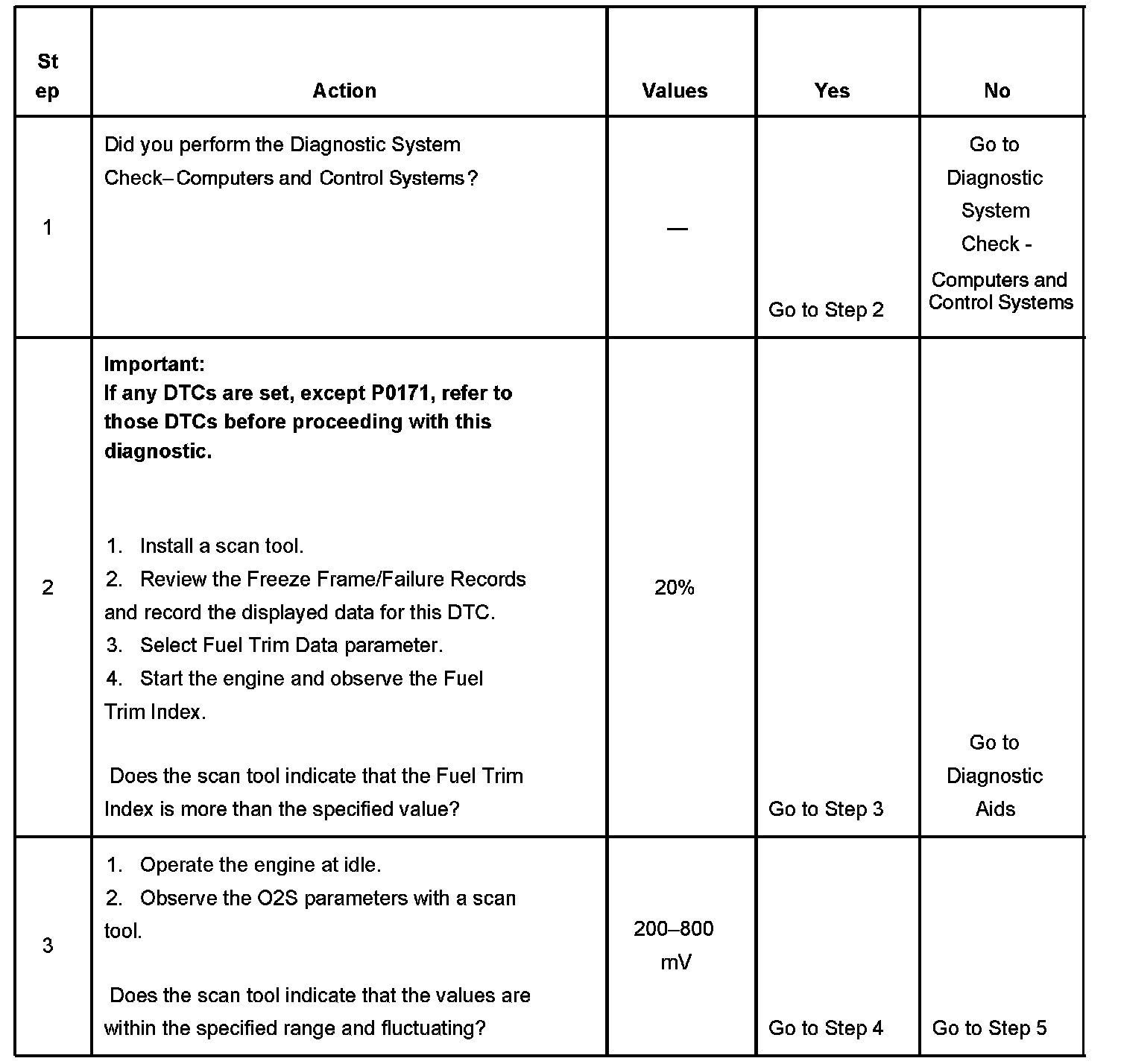 CIRCUIT DESCRIPTIONThe powertrain control module (PCM) controls the air/fuel metering system in order to provide the best possible combination of driveability, fuel economy and emission control. Fuel delivery is controlled differently during open and Closed Loop. During Open Loop, the PCM determines fuel delivery based on sensor signals, without oxygen sensor input. During Closed Loop the PCM adds oxygen sensor inputs to calculate short and long term fuel trim fuel delivery adjustments. Short Term fuel trim values change rapidly in response to the heated oxygen sensor (HO2S) voltage signals. Long Term FT values change slower in response to trends in Short Term FT adjustments. Fuel Trim Index is the average of Short and Long Term Fuel Trim and Purge Learn Memory based on engine speed and load. If the PCM detects an excessively lean condition, DTC P0171 sets.