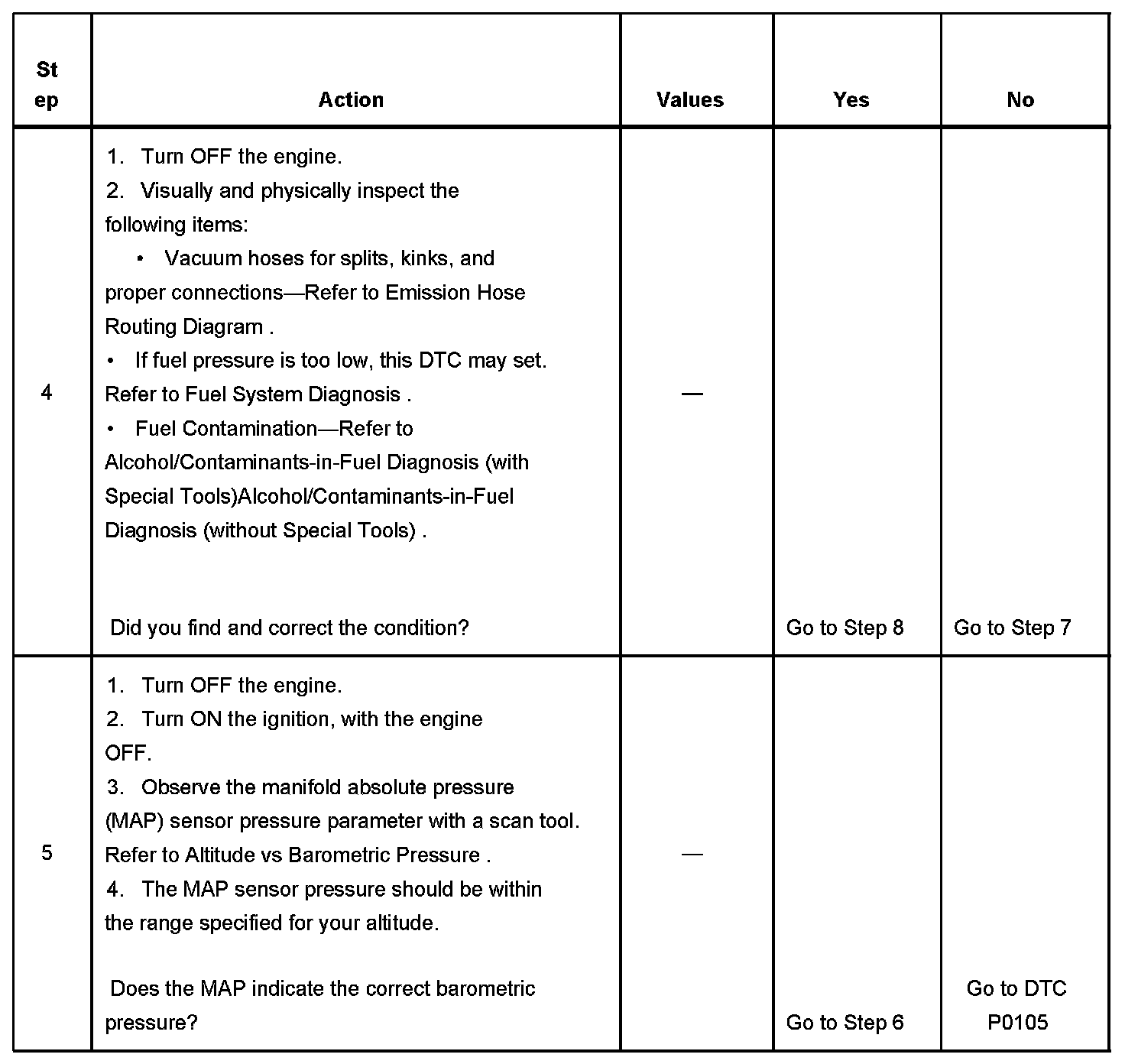 - DTCs P0105, P0107, P0108, P0112, P0113, P0117, P0118, P0122, P0123, P0125 , P0131, P0132, P0133, P0134, P0201-P0204, P0300, P0301-P0304, P0325, P0341, P0446, P0502, P0503, P0506, P0507, P0601, P0602, P1133, or P1441 are not set.
