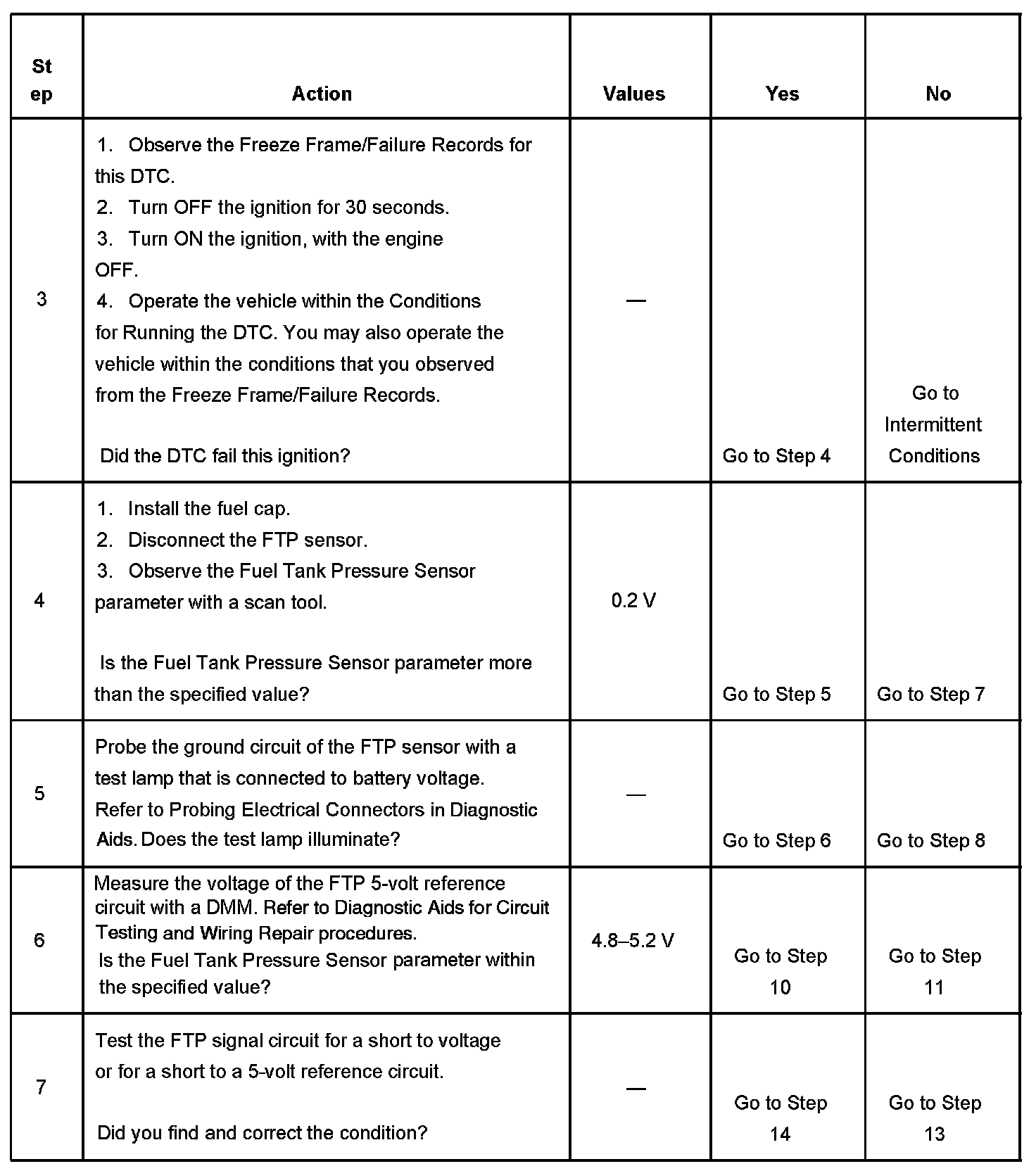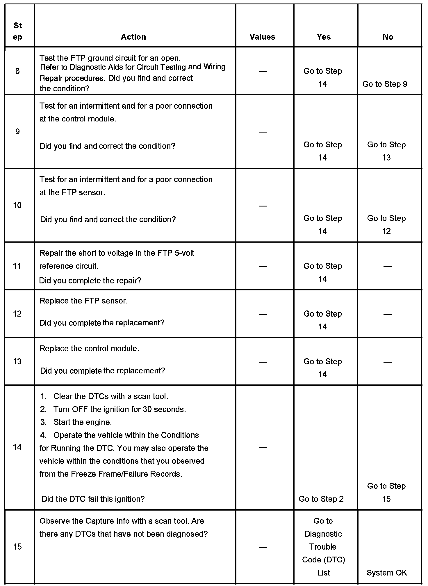 CIRCUIT DESCRIPTIONThe fuel tank pressure (FTP) sensor measures the difference between the air pressure or vacuum in the evaporative emission (EVAP) system, and the outside air pressure. The control module supplies a 5-volt reference and a low reference circuit to the FTP sensor. The FTP sensor signal circuit voltage varies depending on EVAP system pressure or vacuum. If the FTP sensor signal voltage increases above a calibrated value, this DTC sets.