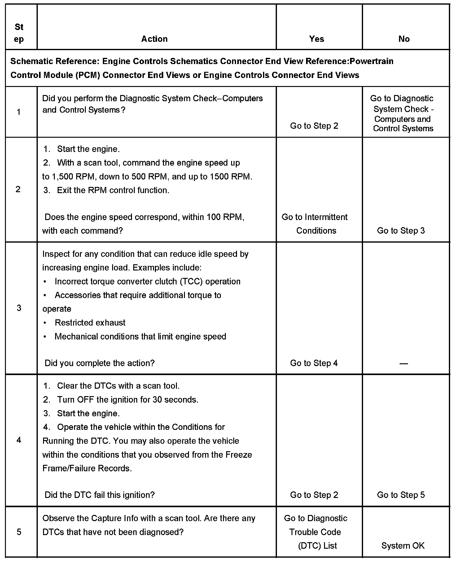 CIRCUIT DESCRIPTIONThe throttle actuator control (TAC) motor is controlled by the powertrain control module (PCM). The DC motor located in the throttle body drives the throttle plate. In order to decrease idle speed, the PCM commands the throttle closed reducing air flow into the engine and the idle speed decreases. In order to increase idle speed, the PCM commands the throttle plate open allowing more air to pass the throttle plate. If the actual idle RPM does not match the desired idle RPM within a calibrated time, this DTC sets.