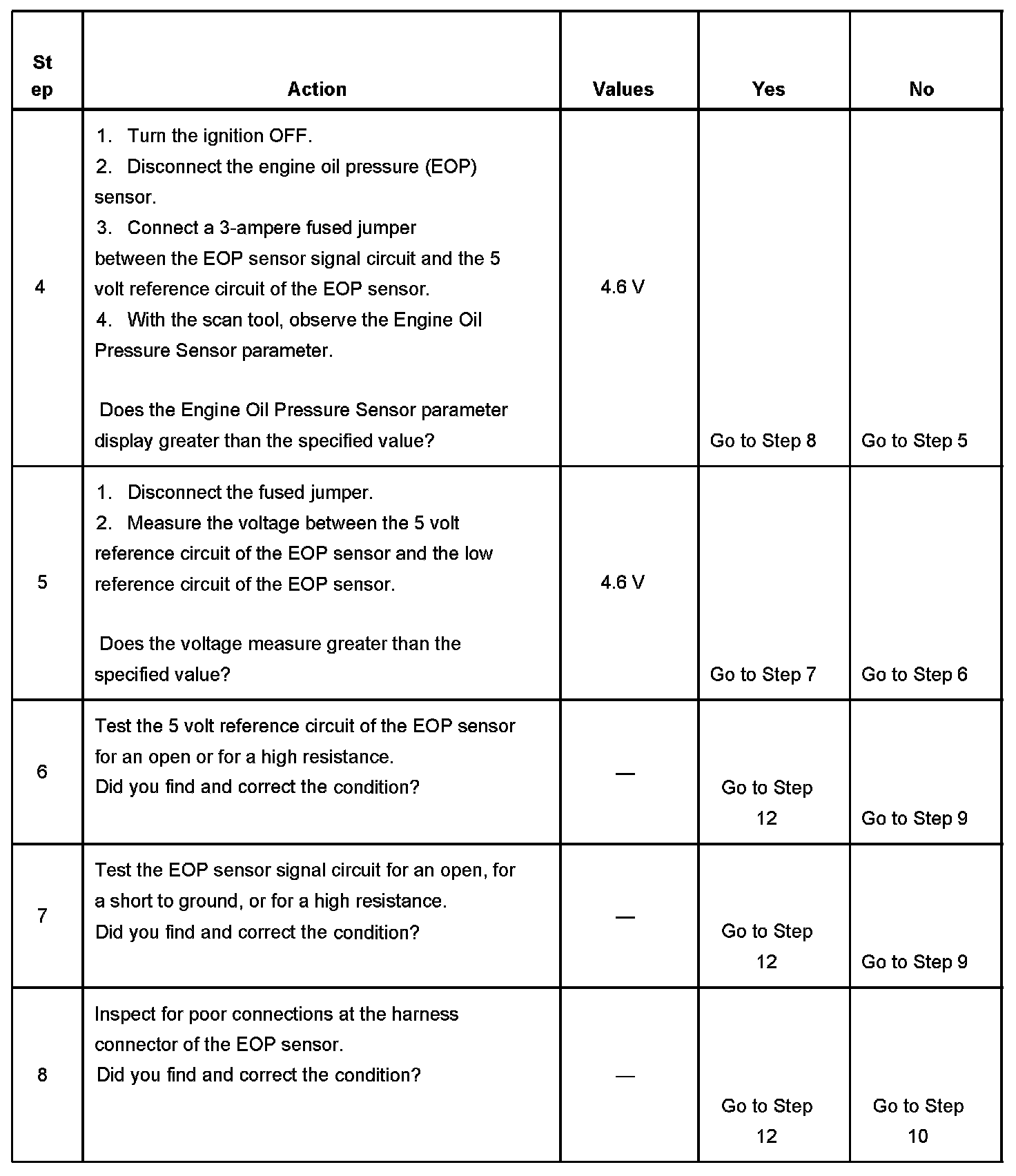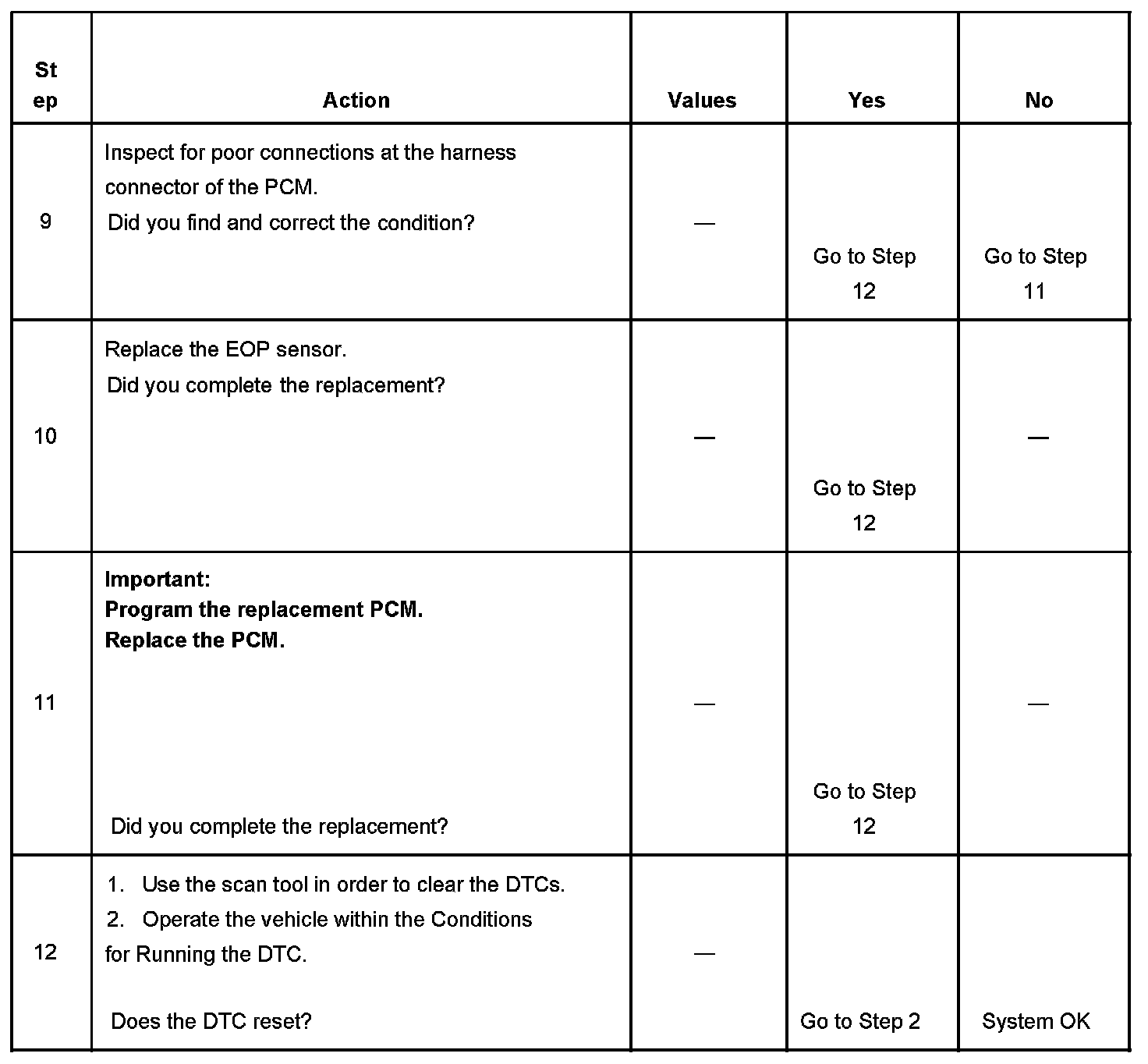 - The PCM detects that the EOP sensor signal circuit is less than 0.4 volts.