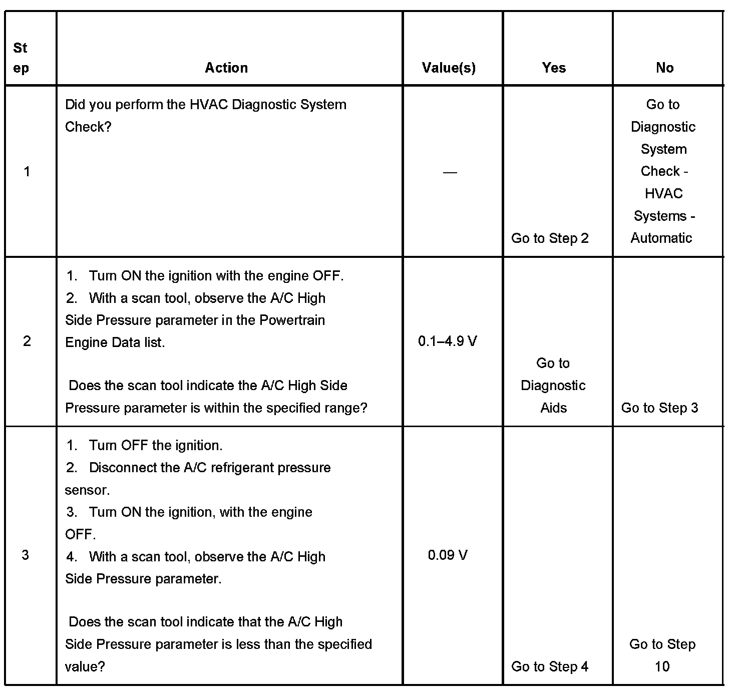 The numbers below refer to the step numbers on the diagnostic table.