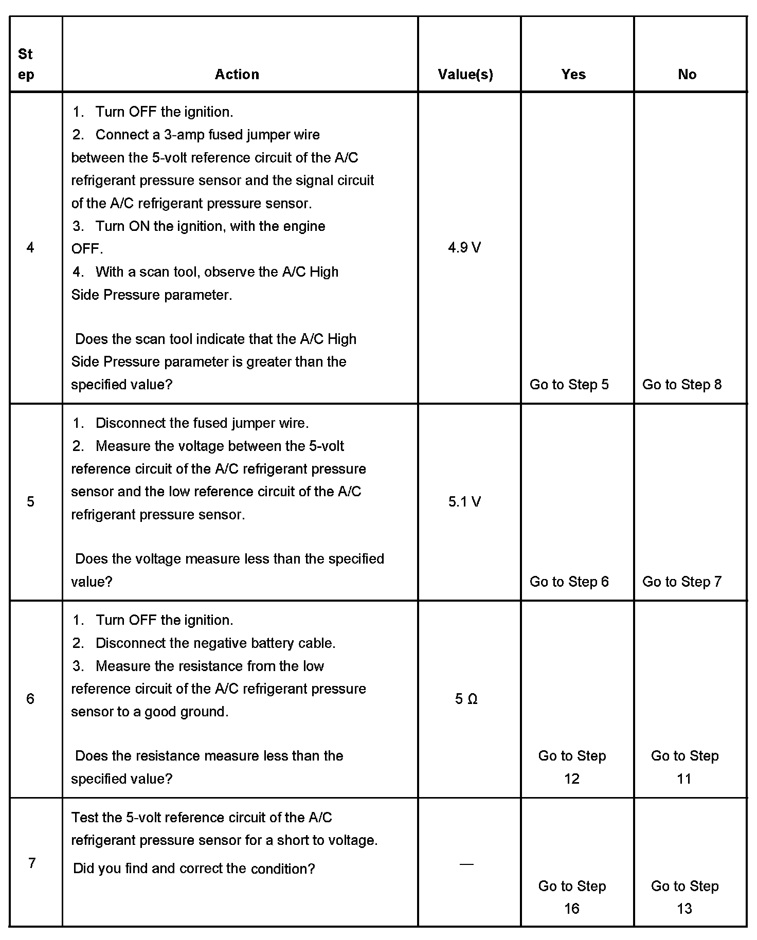 - The A/C refrigerant pressure sensor signal is greater than 4.9 volts for 5 seconds.
