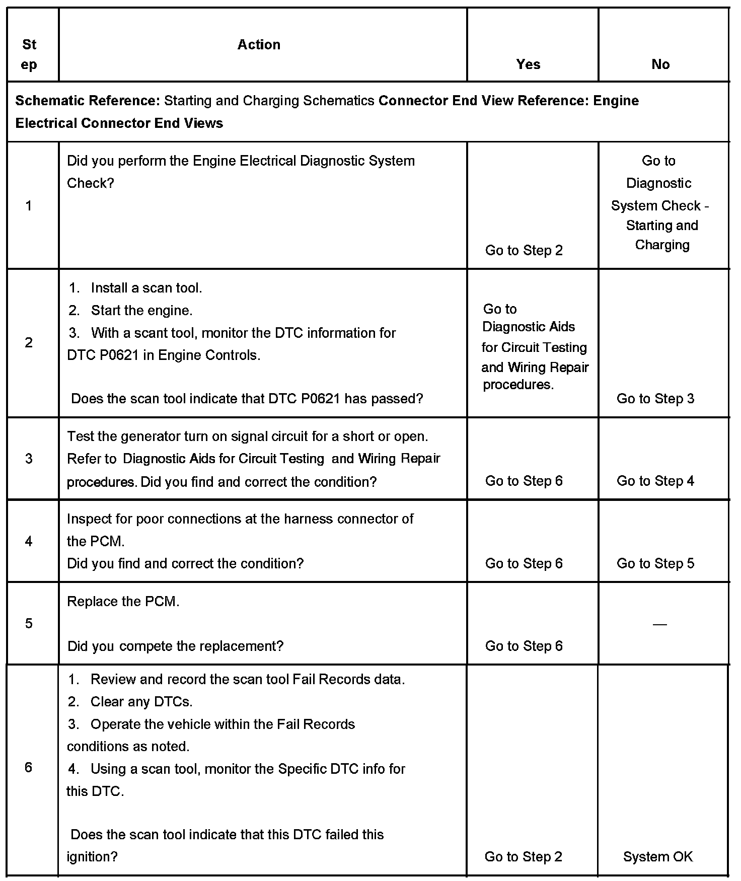 The PCM monitors the state of the generator turn on signal circuit. The PCM should detect a low generator turn on signal circuit voltage when the key is ON and the engine is OFF, or when the charging system malfunctions. With the engine running, the PCM should detect a high generator turn on signal circuit. The PCM performs key ON and RUN tests to determine the status of the generator turn on signal circuit. During the key ON test, if the PCM detects a high generator turn on signal circuit voltage, DTC P0621 will set. DTC P0621 will also set if, during the RUN test, the PCM detects a low generator turn on signal circuit. When the DTC sets, the PCM will send a class 2 serial data message to the IPC to illuminate the charge indicator.