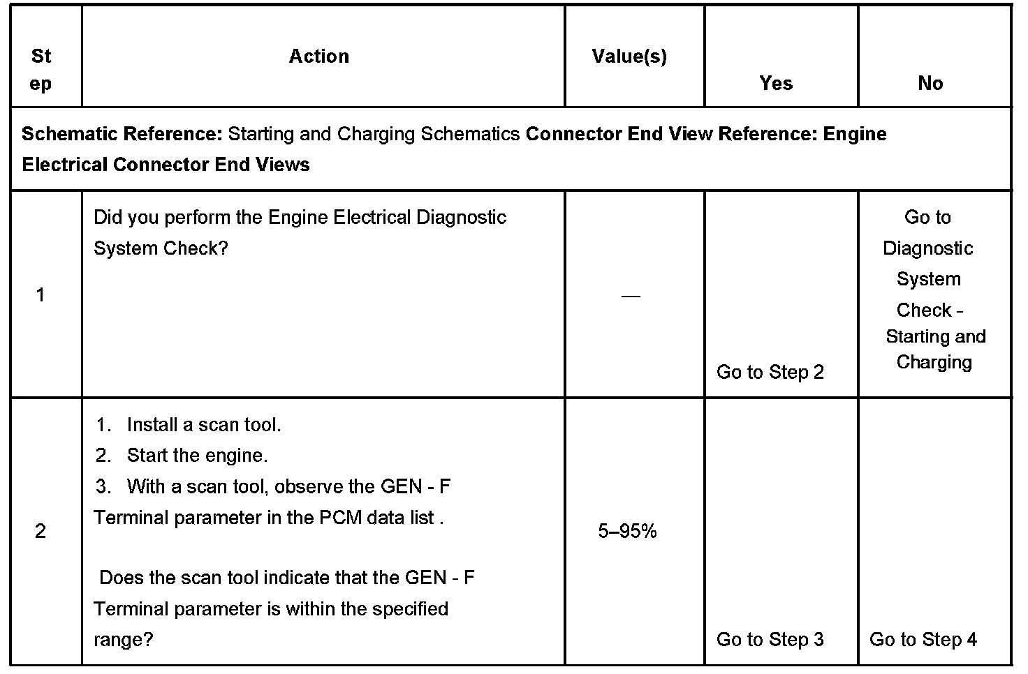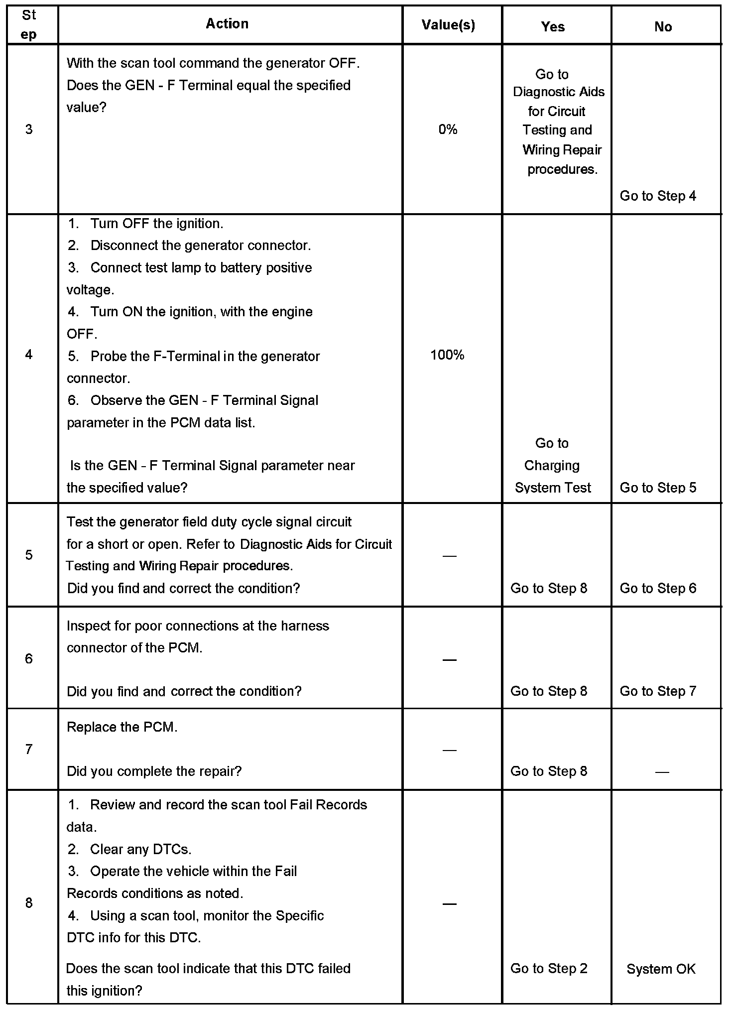 CIRCUIT DESCRIPTIONThe PCM uses the generator field duty cycle signal circuit to monitor the duty cycle of the generator. The generator field duty cycle signal circuit connects to the high side of the field winding in the generator. A pulse width modulated (PWM) high side driver in the voltage regulator turns the field winding ON and OFF. The PCM uses the PWM signal input to determine the generator load on the engine. This allows the PCM to adjust the idle speed to compensate for high electrical loads.