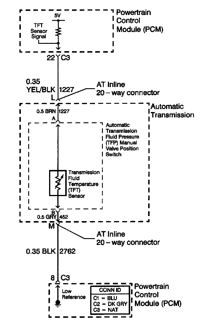 The automatic transmission fluid temperature (TFT) sensor is part of the automatic transmission fluid pressure (TFP) manual valve position switch. The TFT sensor is a resistor, or thermistor, which changes value based on temperature. The sensor has a negative-temperature coefficient. This means that as the temperature increases, the resistance decreases, and as the temperature decreases, the resistance increases. The powertrain control module (PCM supplies a 5-volt reference signal to the sensor on the TFT sensor signal circuit and measures the voltage drop in the circuit. When the transmission fluid is cold, the sensor resistance is high and the PCM detects high signal voltage. As the fluid temperature warms to a normal operating temperature, the resistance becomes less and the signal voltage decreases. The PCM uses this information to control Shift quality and torque converter clutch apply.