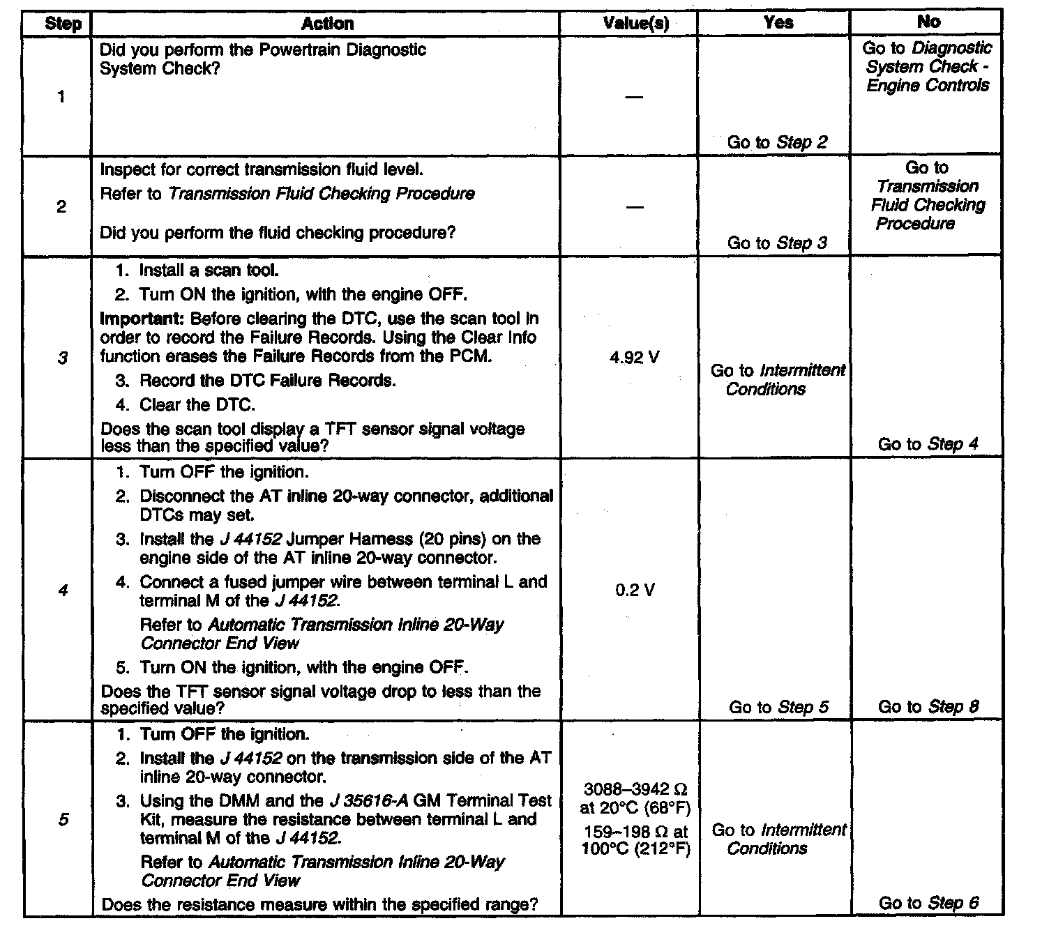 4. This step simulates a TFT sensor DTC P0712. If the PCM recognizes low signal voltage, high temperature, the PCM and wiring are functioning normally.