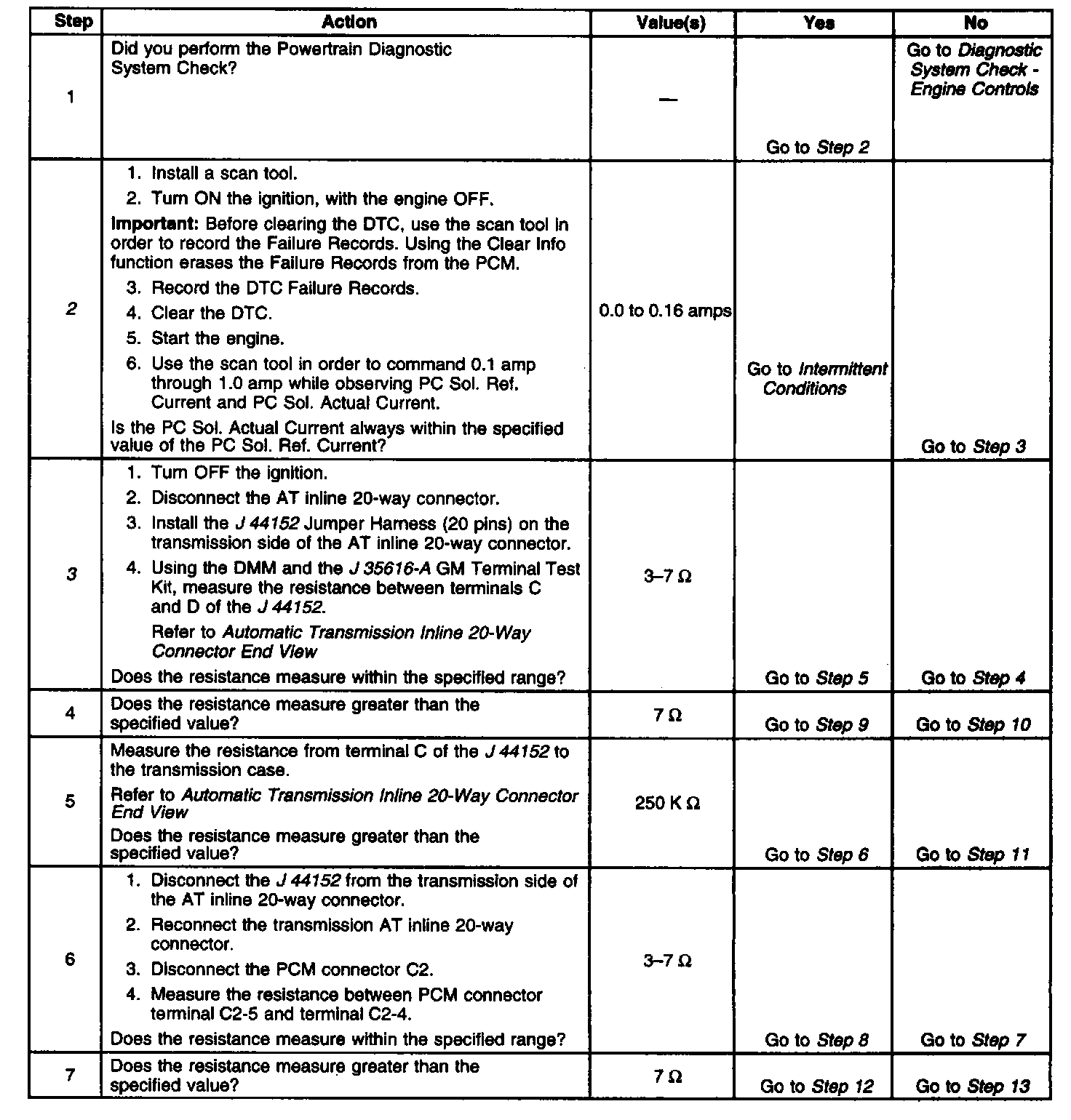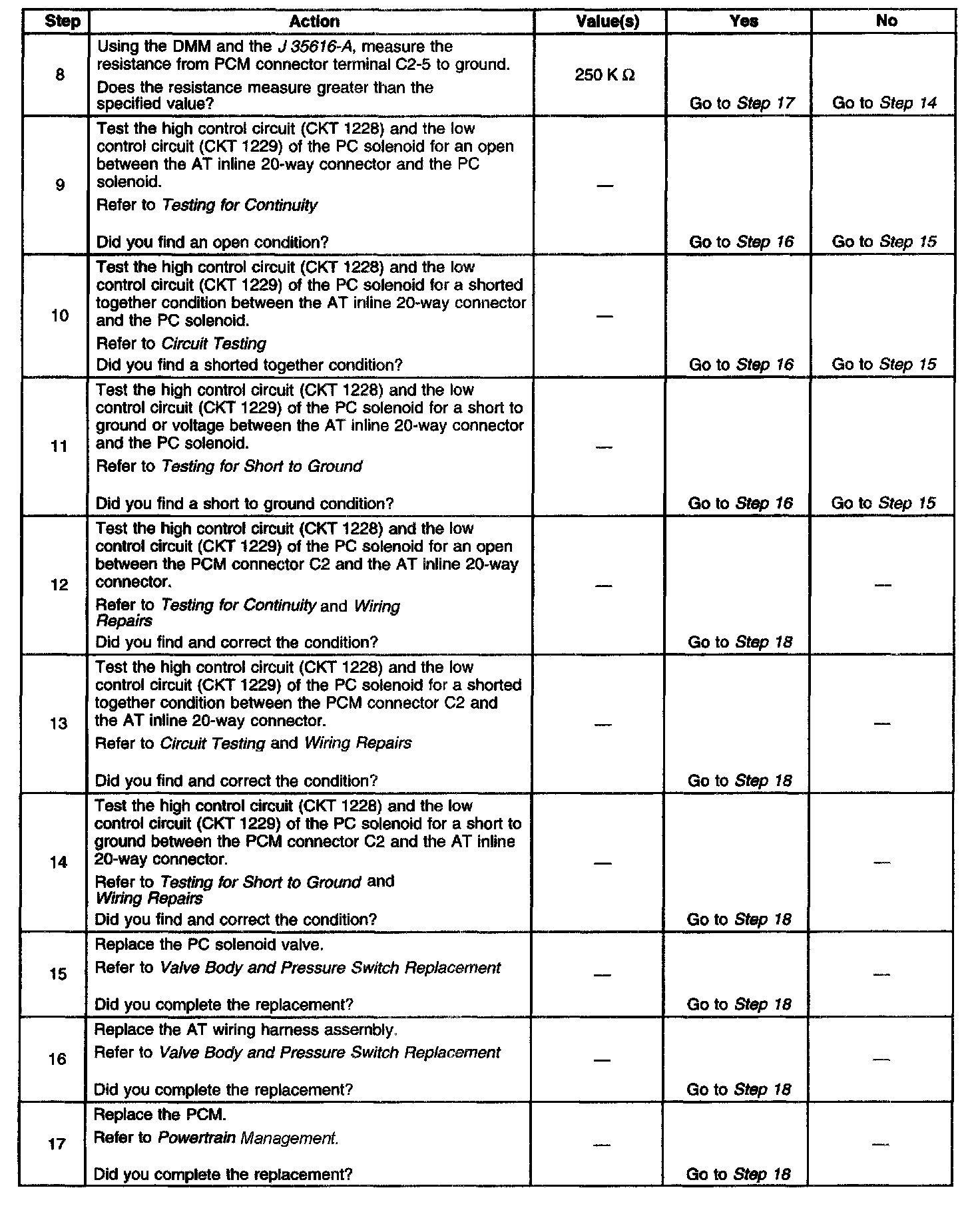 3. This step tests the PC solenoid valve and automatic transmission (AT) wiring harness assembly for incorrect resistance.