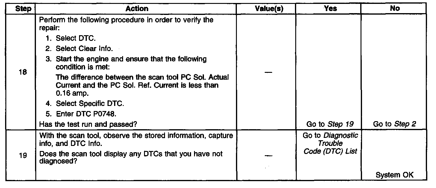 When the PCM detects a continuous open or short in the PC solenoid valve circuit, then DTC P0748 sets. DTC P0748is a type C DTC.
