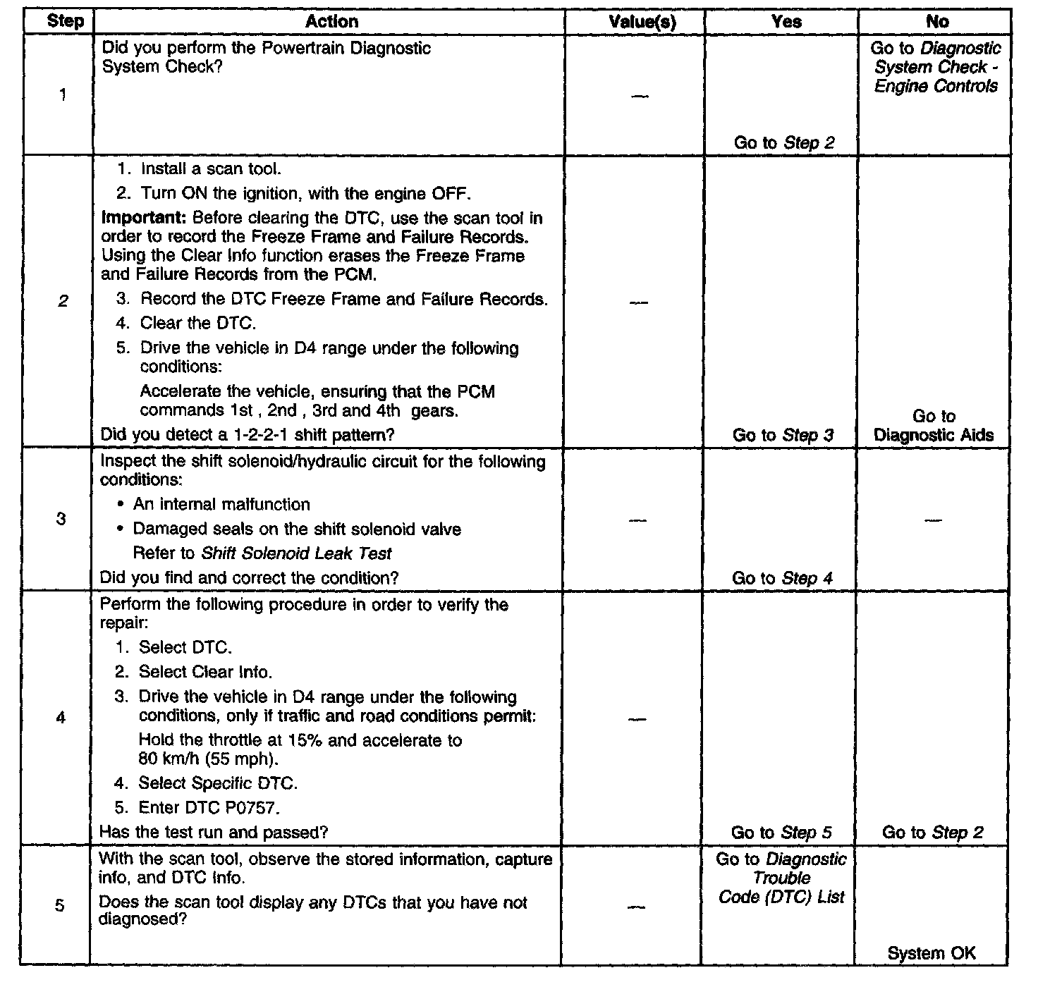 When the PCM detects a 1-2-2-1 Shift pattern, then DTC P0757 sets. DTC P0757 is a type A DTC.