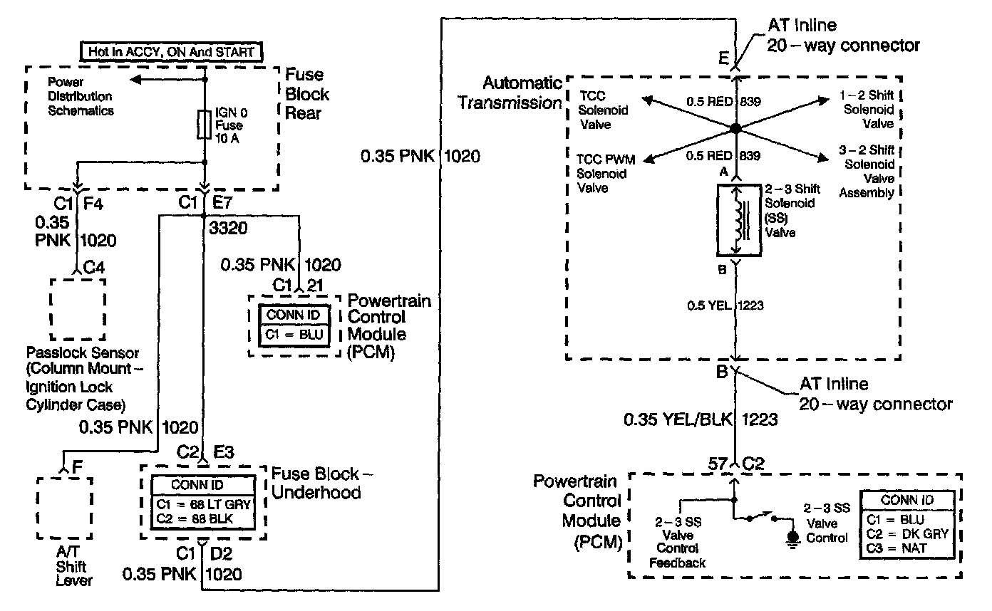 The 2-3 Shift solenoid (SS) valve controls the fluid flow acting on the 2-3 Shift valves. The solenoid is a normally-open exhaust valve. With the 1-2 SS valve, the 2-3 SS valve allows four different shifting combinations. The solenoid attaches to the control valve body within the transmission. The 2-3 SS valve receives ignition voltage through the OFF/ON/CRANK voltage circuit. The powertrain control module (PCM) controls the solenoid by providing the ground path on the 2-3 SS valve control circuit.
